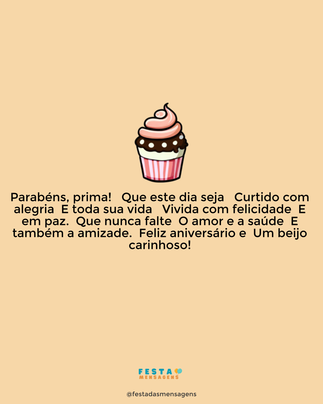 Parabéns! Que todos os votos de felicidades cheguem até ao trono de Deus, para realizá-los o mais rápido possível. É festa no olhar de todas as pessoas que têm um abraço para lhe ofertar, e uma palavra de carinho para lhe dedicar. Você merece, e os homenageados de hoje somos todos nós que temos a sua amizade. Que Deus abençoe você a cada ano, e que essa nova idade lhe traga muitas chances para vencer, pois você merece. Muitos anos de vida, e um feliz aniversário!