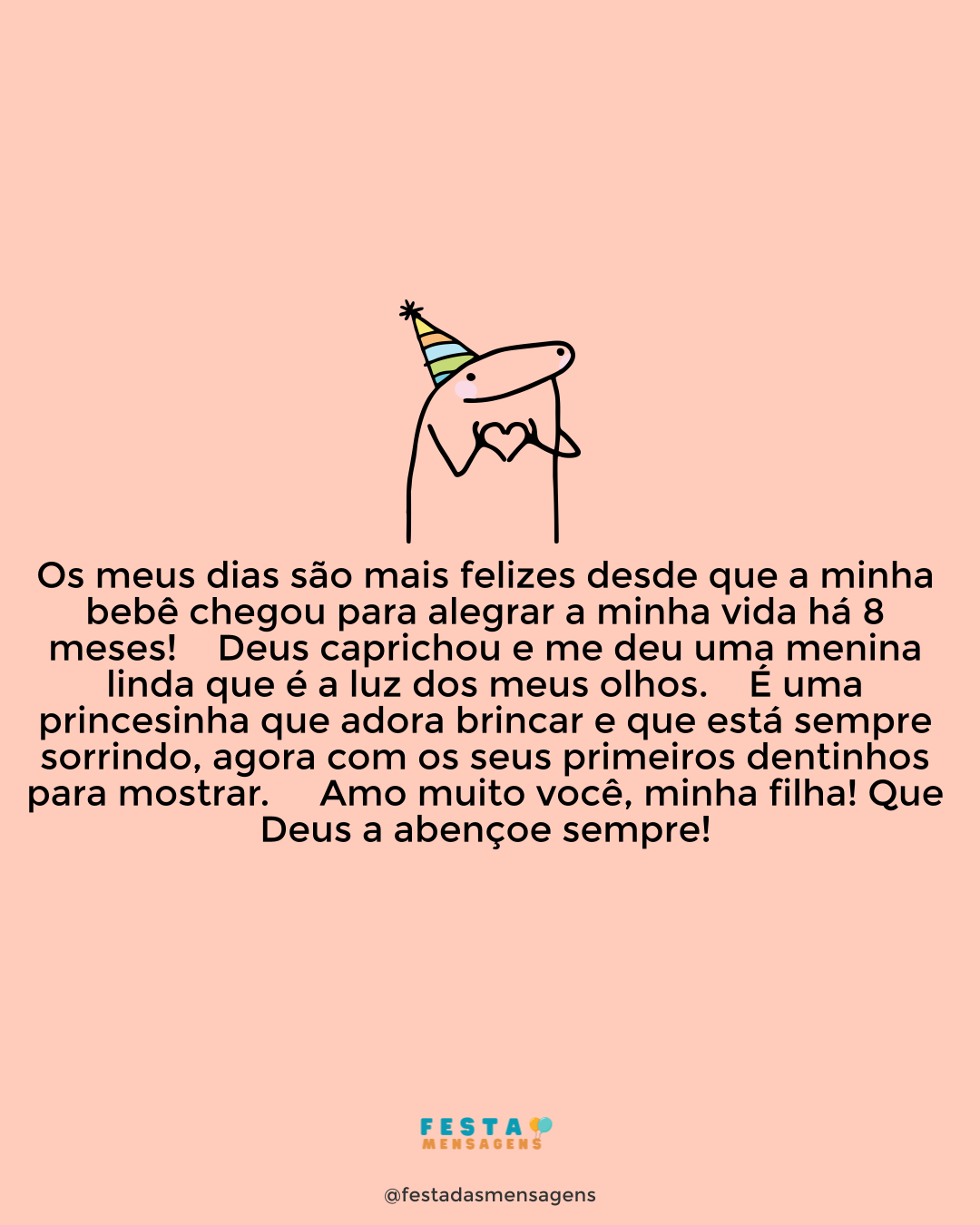 Meu maninho, meu chaveirinho, meu amorzinho. Você sabe como eu o amo e como você é especial para mim. Eu sei que algumas vezes não tenho muita paciência, mas você é a coisa mais fofa da minha vida, o meu bem maior apesar de pequenino. Hoje nós vamos cantar parabéns para você e apagar as suas velinhas com muita felicidade no coração. Hoje é dia de bolo, brigadeiros e presentes, tudo para celebrar o seu aniversário, o dia da sua vinda para as nossas vidas. Parabéns e muitas felicidades! Que a sua vida seja sempre doce e cheia de alegria. Te amo muitão e fortão!