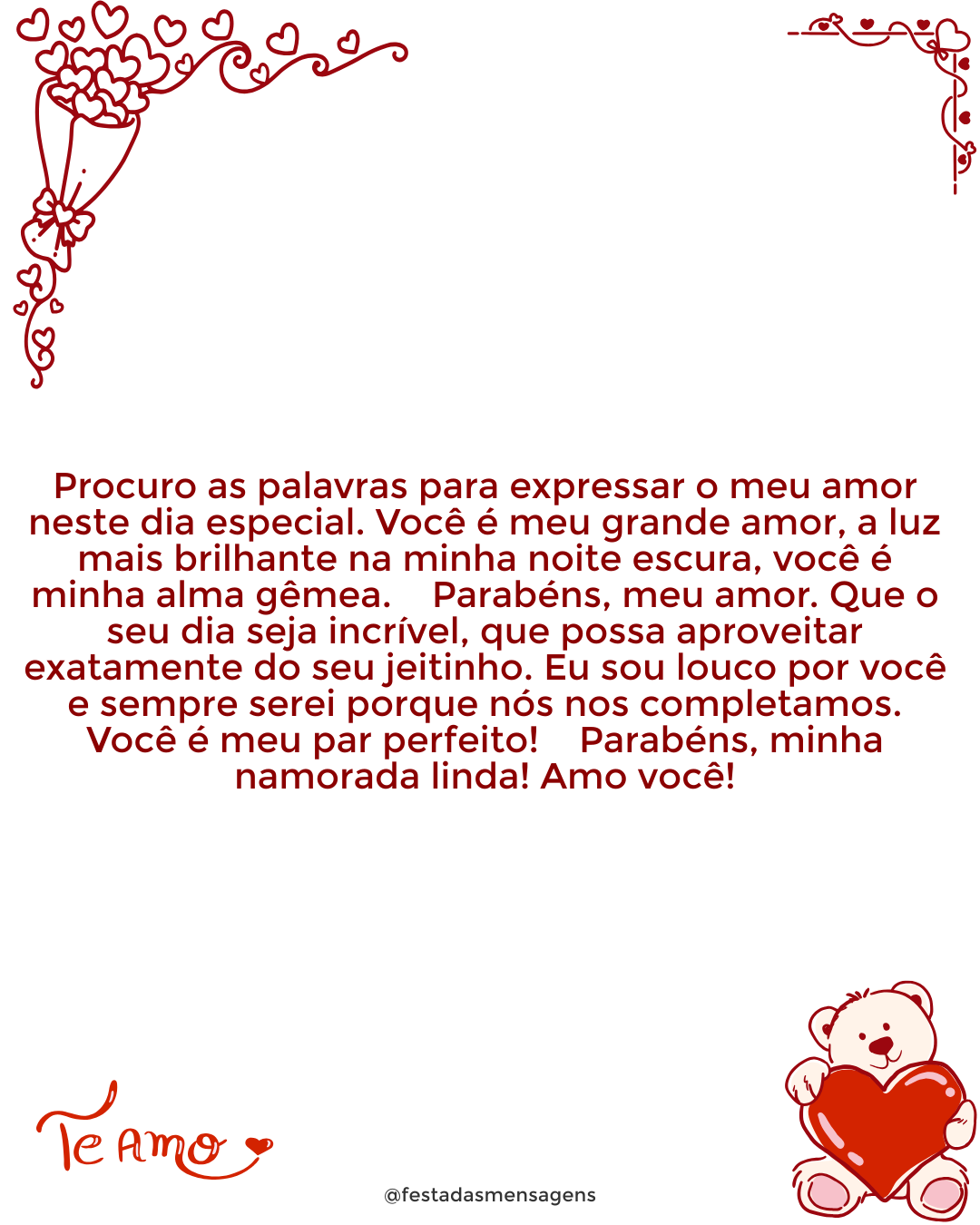 Parabéns! Hoje você comemora seu vigésimo segundo aniversário. Tenho muito orgulho e uma profunda admiração pela pessoa que você tornou ao longo do tempo. Mais do que alguém especial, você é um ser humano diferente, belo, inesquecível. E hoje, no seu grande dia, eu só espero que belas e renovadas sensações assaltem sua festa. Nunca deixe de ser essa pessoa tão querida e marcante. Prepare-se para os novos desafios que a vida está lhe preparando para esse novo ano que está começando agora. Desejo que você abra muitos e bons presentes, todos com origem no mais importante: o coração. Viva sempre com um sorriso e nunca desista de lutar por aquilo que acredita. Feliz aniversário!