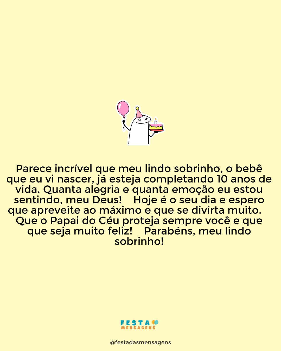 Parabéns, menino! Como é possível você ter crescido tão rápido? É incrível como o conheci tão pequeno e hoje está quase do meu tamanho. Saiba que sua mãe é uma grande amiga que respeito e tenho muita admiração. Divirta-se muito. A vida existe para ser saboreada, aproveitada em grande estilo. Nunca deixe de correr atrás dos seus sonhos, de tornar real aquele desejo que parece tão distante. Conte comigo para tudo; a minha amizade será sempre sua também. Que hoje tudo seja maravilhoso. Curta muitos seus presentes e, acima de tudo, sinta-se em paz. Feliz aniversário.