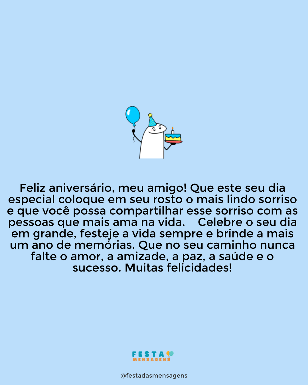 Feliz Aniversário! Este é um dia grandioso, pois o milagre da vida se renova para você em mais um ciclo que começa hoje. Receba essa bênção de Deus com alegria e gratidão, e aproveite a maravilhosa dádiva que é a vida. Faça mais amigos, espalhe o bem e seja feliz. Espero que Deus abençoe você com saúde, paz e amor, e guie sempre seus passos pelo caminho da felicidade. Parabéns e fique na paz do Senhor!