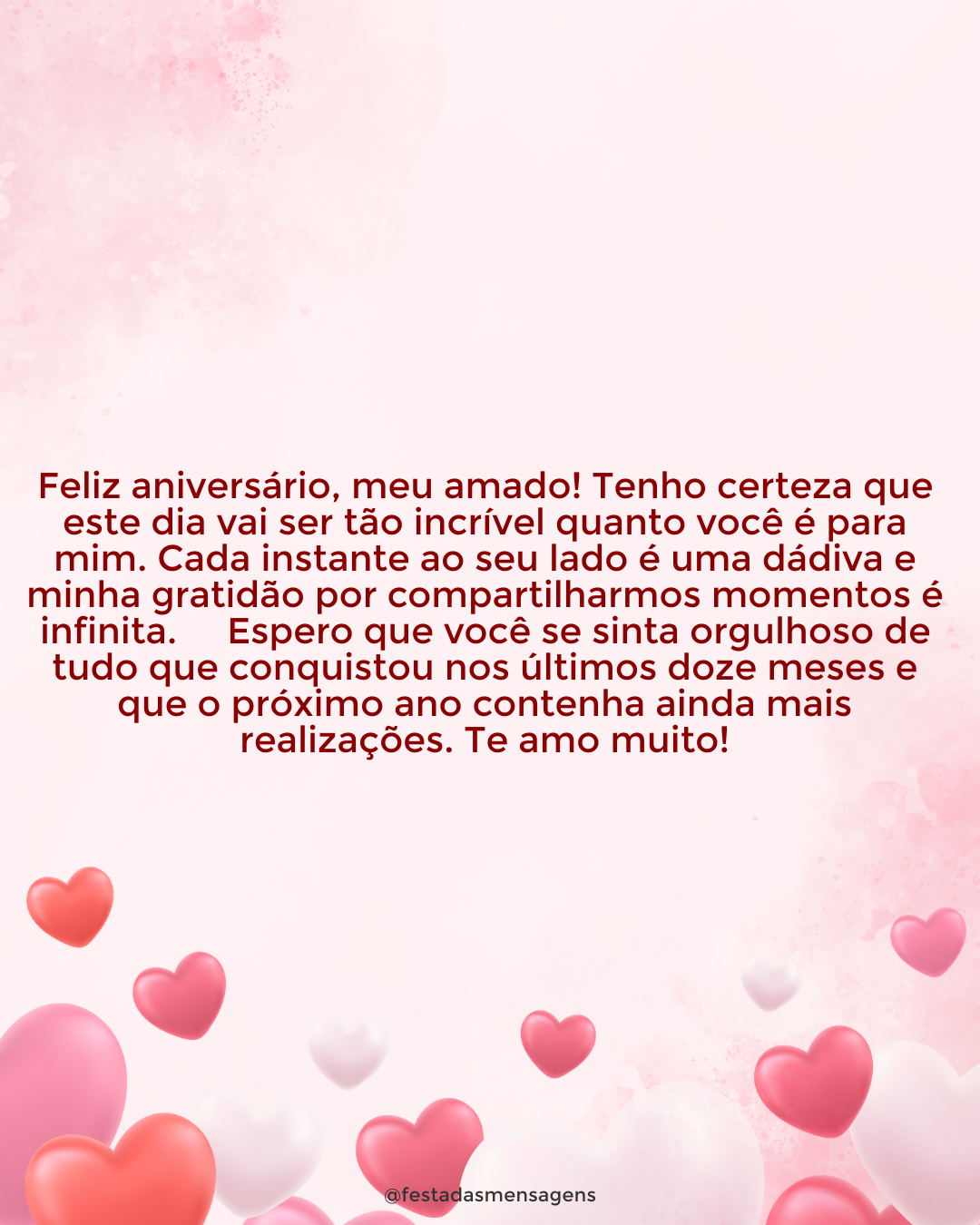 Feliz aniversário, meu amor! Pode não estar mais aqui do meu lado para celebrar o seu aniversário, mas esteja onde estiver, saiba que continua vivo no meu coração e que ninguém jamais ocupará o seu lugar. Esta data é agora um pouco triste, pois você não está mais junto de nós para receber os presentes e o meu amor. Sinto a sua falta, meu amor, particularmente neste dia, e tenho uma vontade enorme de chorar. Mas sei como odeia que eu esteja triste, por isso, vou fazer de tudo para lhe dar o único presente que ainda lhe posso dar, o meu sorriso.
