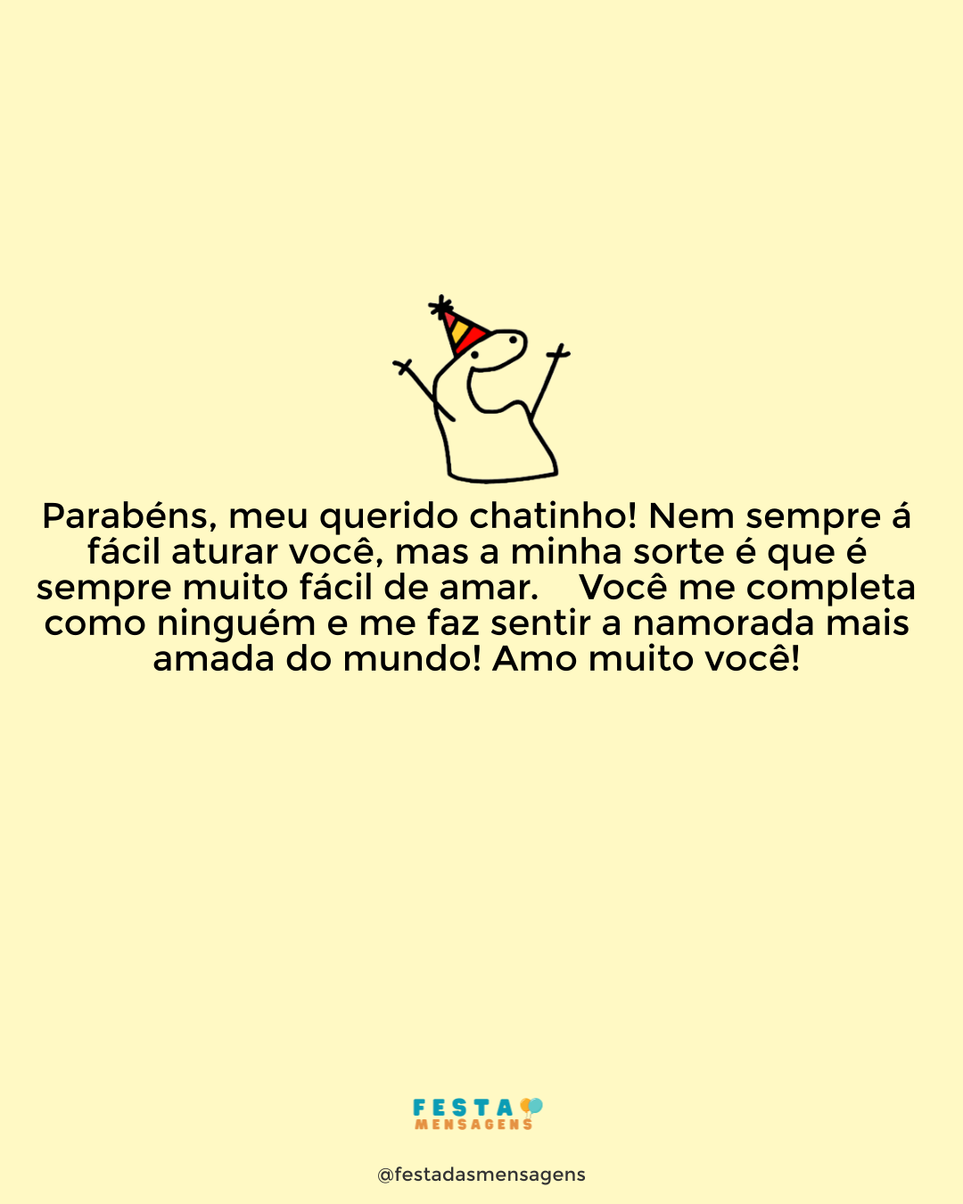Parabéns, amor! Que este dia seja mega divertido, do jeito que você merece. Curta esta jornada ao lado de quem mais ama e divirta-se, sem medos nem preconceitos. Você é tudo para mim! Meu bem, neste seu aniversário eu quero que você saiba que me arrependo de todas as vezes que lhe chamei chato. É que independentemente disso ser verdade, você é mais do que isso: você é meu grande amor! Feliz aniversário, meu príncipe!