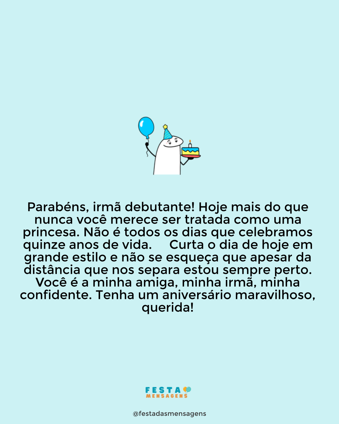 Meu bem, é mesmo verdade que já passaram quinze anos desde a linda data do seu nascimento? Sobrinha, parabéns por mais um ano de vida e por ser a debutante mais bela do mundo! Curta todos os momentos do seu lindo e maravilhoso dia e prepare-se para essa incrível e marcante etapa da adolescência. Aproveite-a, agarre-a com unhas e dentes e viva-a com muito juízo! Eu gosto muito de você e confesso estar cheia de emoção por testemunhar esta sua jornada de princesa! Tenho certeza que este dia ficará para sempre marcado no seu coração e pensamento. Feliz aniversário, debutante!