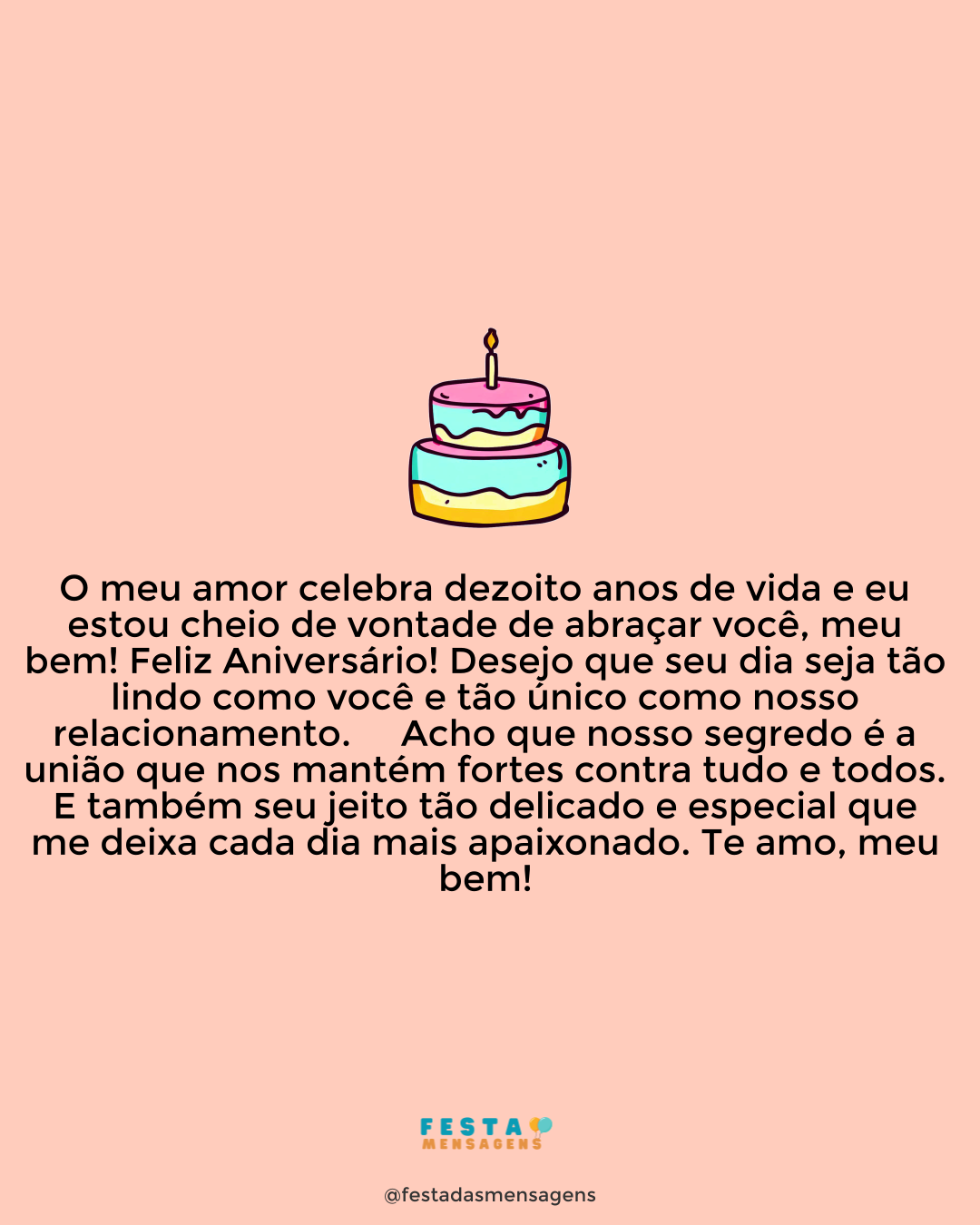 Hoje é seu dia especial! Você sabe muito bem que é mais do que um amigo para mim. Nossa amizade vai muito além e hoje quero lhe dar um abraço muito apertado e desejar tudo de bom neste novo ano. Que seu aniversário seja incrível, que possamos estar perto e que você aproveite cada segundo. Gosto muito de você e acho que sabe muito bem tudo que significa para mim. Tenha um feliz aniversário, meu bem!