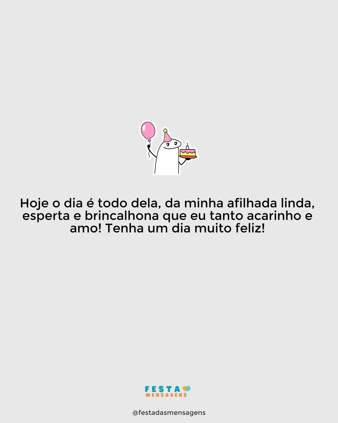 Se ainda estivesse entre nós hoje você completaria mais um ano de vida. É seu aniversário, minha saudosa madrinha, mas você já não está mais aqui para a poder felicitar, lhe dar um abraço e um beijo, lhe dizer pessoalmente que a amo. Sinto muitas saudades suas, minha dinda, mas sei que onde está agora, está olhando por mim também. Você sempre foi por demais bondosa, generosa, carinhosa, e talvez por isso tenha partido, pois este mundo não merece uma pessoa tão especial quanto você. Mesmo já não estando mais aqui, eu para sempre vou recordar você, nossos momentos, seu aniversário e todas as outras datas que eram importantes para você. Você partiu, dinda querida, mas para sempre estará comigo em meu coração. Te amo eternamente!