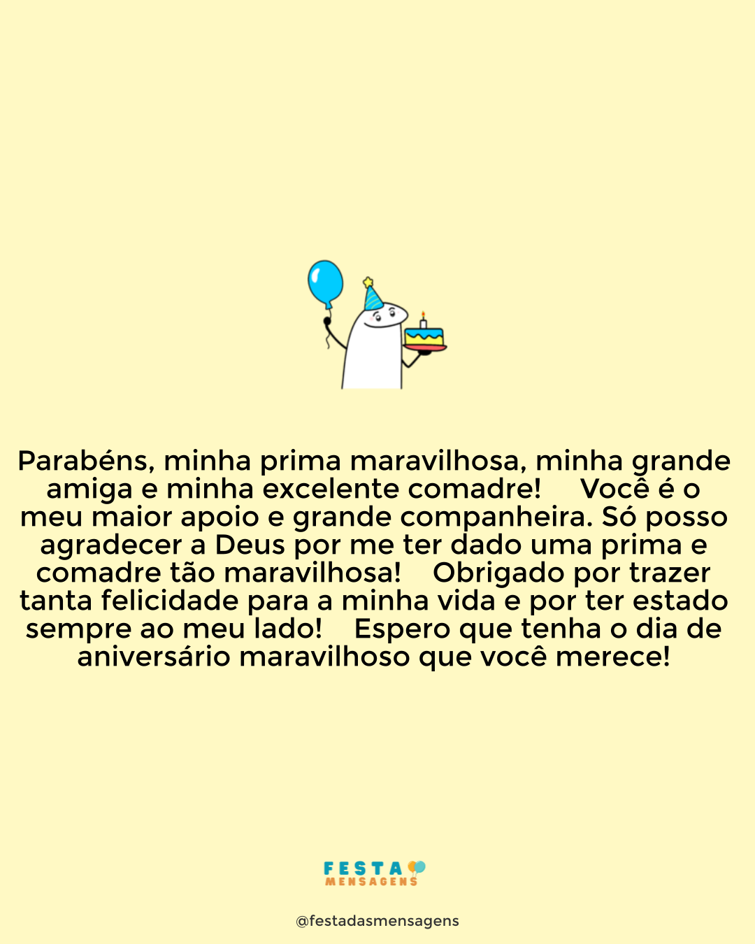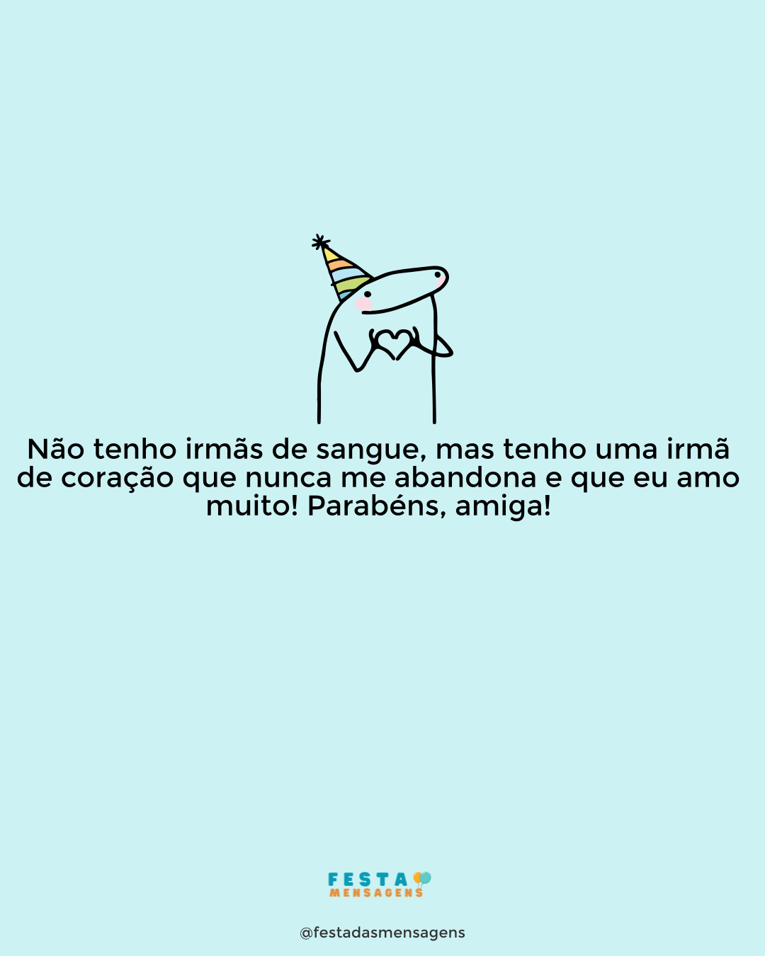 A vida me deu uma grande amiga, alguém que adoro e por quem faria qualquer coisa, mesmo conhecendo há tão pouco tempo. Hoje, meu bem, é dia de festa. Divirta-se no seu aniversário! Parabéns! Aproveito para lhe confessar que todos os dias agradeço sua amizade, seu carinho constante, sua palavra sempre doce e sábia. Você é como uma irmã para mim, uma das melhores pessoas que algum dia conheci neste mundo! Curta sua jornada e lembre-se: você é espetacular! Feliz aniversário, amiga!