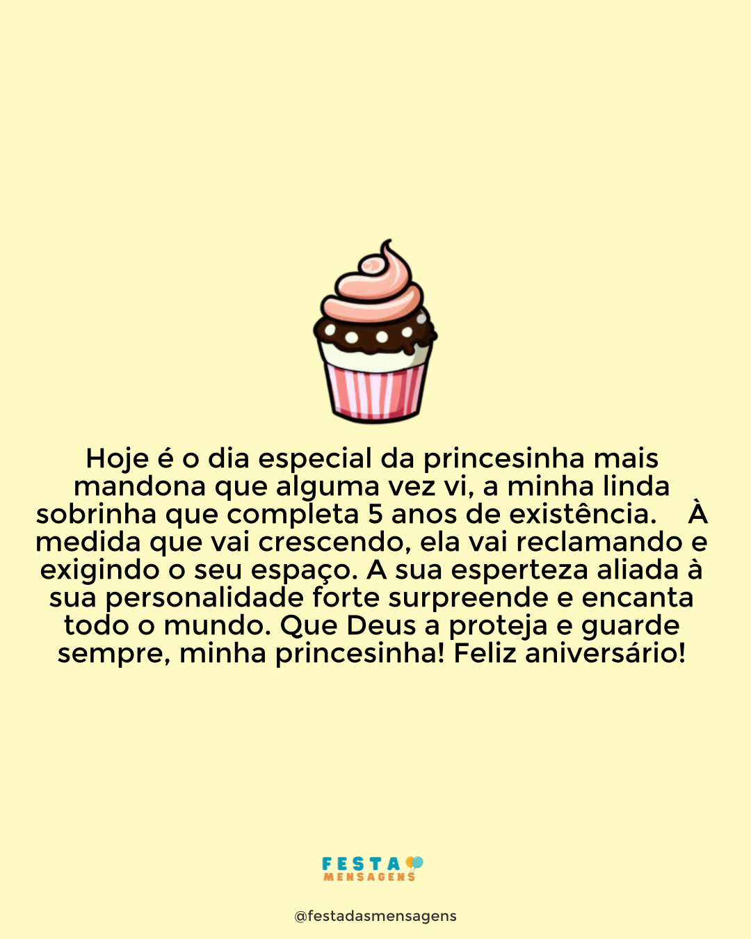 Meu Deus, como o tempo passa! Você está tão crescida, minha querida sobrinha, já está celebrando o seu 5º aniversário. Hoje vai ser um dia muito especial, vai estar rodeada pelos seus amiguinhos e pelas pessoas que tanto lhe querem bem e isto com muitos presentes à mistura. Ainda falta muito tempo até decidir o rumo que vai tomar, ainda vão acontecer muitas coisas boas na sua vida, mas quer escolha ser médica, advogada ou simplesmente viajar pelo mundo, saiba que estarei sempre aqui para a apoiar e a torcer por você. Curta muito o seu dia! Feliz aniversário, minha querida sobrinha!