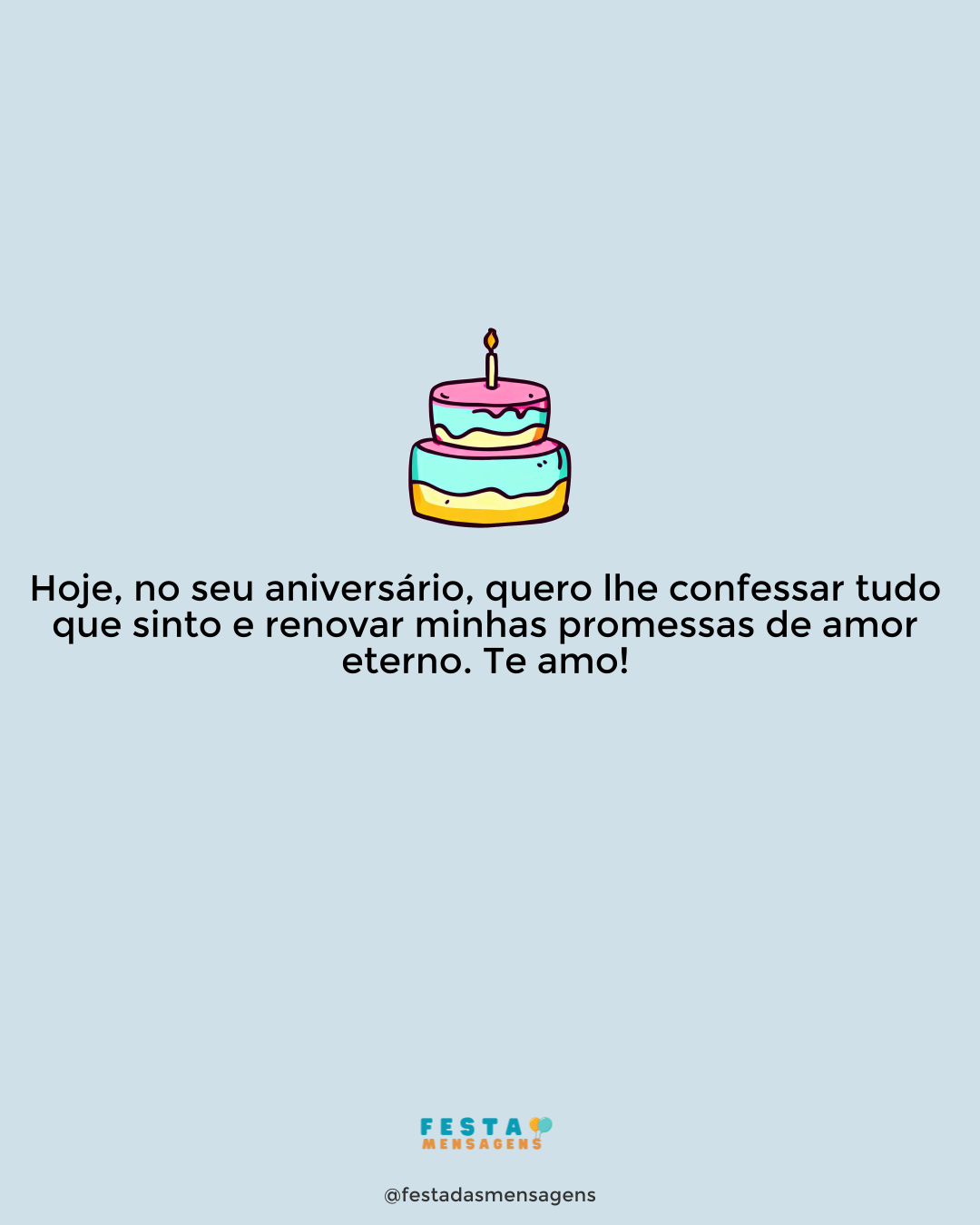 Parabéns a você! Chegou o momento de sorrir como nunca, de dançar e pular de alegria. Hoje o dia é seu e sua idade não é importante. O que interessa de verdade é sentir a cabeça fresca e a energia no coração. Você viveu muitos anos e continua jovem. Tenho muito orgulho em você fazer parte da minha vida. Nunca mude e lembre-se que estarei sempre pensando em você. Feliz Aniversário!