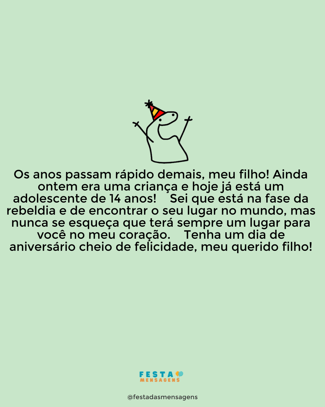 Há 14 anos, você chegou, filha, me mostrando que eu ainda não sabia nada. Só quando você nasceu, descobri o que era amor incondicional. Agora, você já está crescida, já é uma mocinha, mas este amor segue sendo o mesmo. Que você seja feliz no seu dia especial. Que possa aproveitar a companhia de pessoas amadas e que possa curtir cada momento. Você é o que tenho de mais importante na minha vida e espero que saiba que estarei sempre aqui, para tudo que precisar. Sorria, filha, pois hoje o dia é todo seu. Feliz aniversário!
