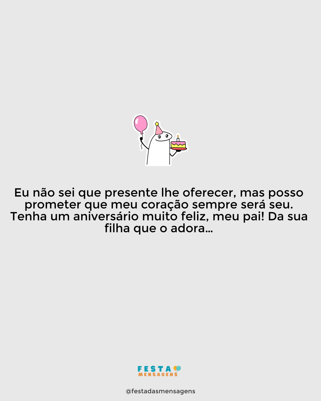 Sou imensamente feliz por ter você na minha vida, querido sogro! Sinto que você é como um pai para mim; talvez seja mesmo um segundo pai. Gostaria de agradecer por todas as coisas que já me proporcionou, por todas as palavras de conforto e ensinamento. Mas quero muito agradecer por ter marcado meu aniversário de um modo muito especial! Na verdade, jamais vou esquecer o abraço que senti de você e de todos que celebraram meu dia de aniversário! A vida pode dar muitas reviravoltas, mas tenho certeza que nossa relação de amizade vai durar uma vida inteira.