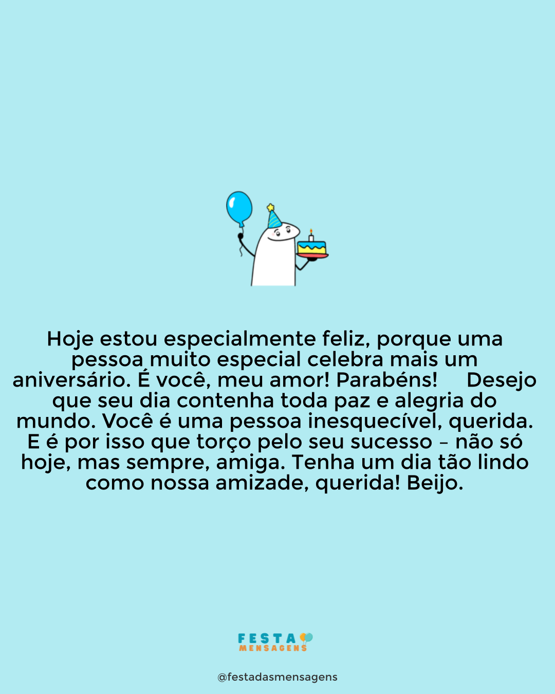 Feliz Aniversário, amigo! Você é uma pessoa maravilhosa. Tem um coração de ouro e um jeito de encarar a vida e de enxergar as pessoas que é muito revelador. Sua bondade é evidente porque você vive seguindo a palavra do Senhor e isso é a maior dádiva da existência. Desejo que você conheça toda felicidade e paz no dia de hoje. Gosto muito de você, meu bom amigo!
