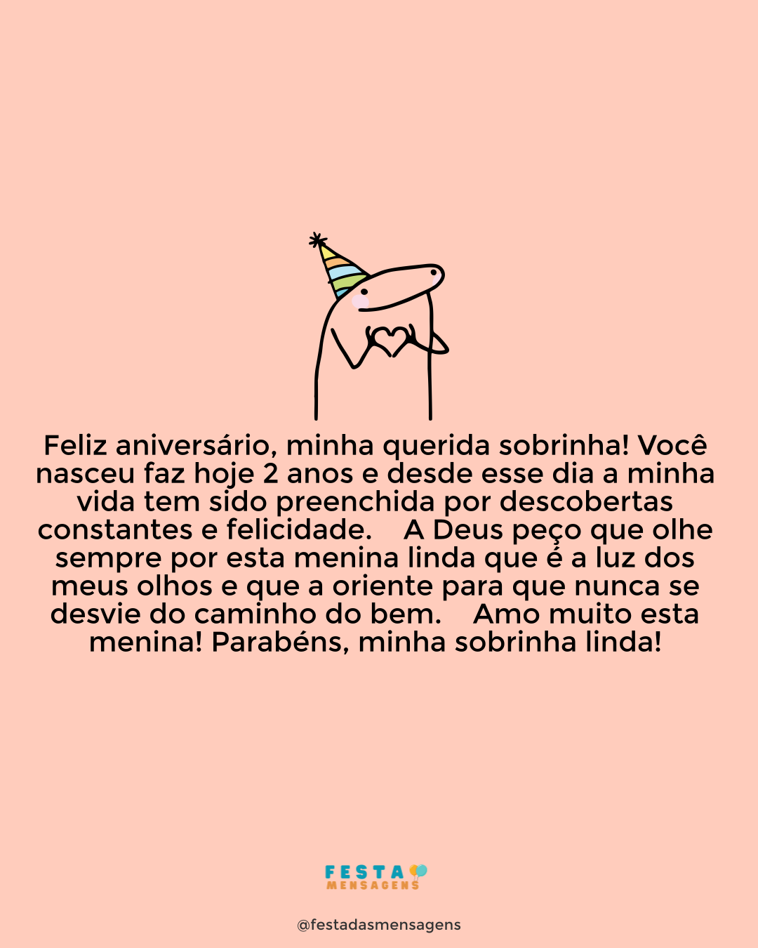 Hoje é seu aniversário, querida, e eu quero lhe agradecer por ser a sobrinha que sempre sonhei ter na vida. Parabéns pelo quarto ano de alegrias, aventuras e felicidade sem fim! Tenho muito, muito orgulho por pertencermos à mesma família, mas também pela amizade que construímos desde sempre e pela admiração mútua. Você é a melhor sobrinha do mundo! Estou aqui torcendo para que este dia seja um dos mais coloridos até hoje e também para que a vida seja sempre sua grande aliada. Divirta-se muito, hoje e sempre, princesinha!