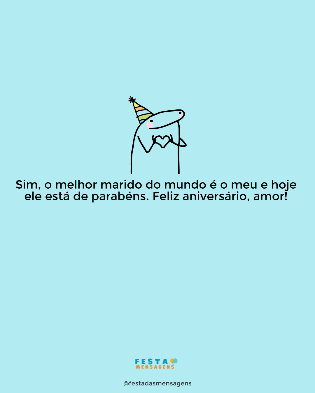 Parabéns, meu amor! Você é a pessoa mais linda que conheço, a razão de toda minha felicidade. Desejo que este seu aniversário fique marcado por momentos únicos de paz e muita alegria. Continue assim: lindo e com um coração maior do que o mundo, meu bem. Não desista de alcançar seus sonhos e lembre-se que seremos sempre um só ser, uma só coisa, um só amor. Adoro você, meu bem!