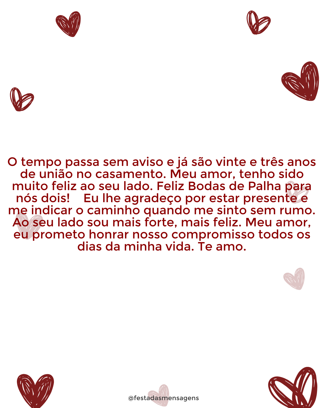 Nesta data, há doze anos, dissemos o ‘sim’, essa palavrinha tão pequena mas que significou tanto na nossa vida. Desde esse momento prometemos ser felizes juntos, e é isso que temos feito todos os dias. Feliz aniversário de casamento, meu amor! Eu nunca tive qualquer dúvida, mas hoje sei com toda a certeza que casar com você foi a melhor decisão da minha vida. Ao seu lado viver tem sido uma aventura maravilhosa. Ao seu lado eu me sinto forte e não existem obstáculos ou dificuldades que juntos não sejamos capazes de ultrapassar, pois o nosso amor é certeza de vitória. Meu amor, com ilusão aguardo todos os anos que ainda virão e que viveremos juntos. Eu te amo! Hoje e para sempre eu vou amar você, sem condições ou limitações.