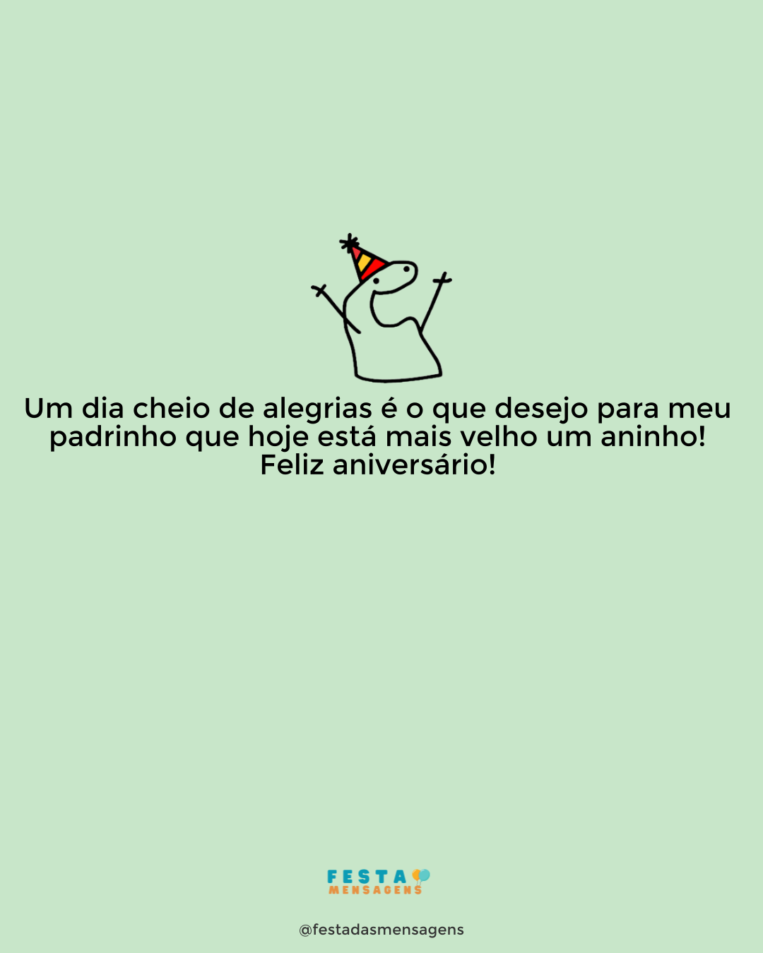 Para mim, você é como um irmão, ou melhor, como um pai. Padrinho, eu gosto de você de uma forma quase inexplicável. Torço para que seu dia seja incrível igual nosso relacionamento. Feliz aniversário! Aproveite muito e divirta-se! Celebre todos os segundinhos desta jornada que promete se tornar memorável. Reúna todas as pessoas que ama, amigos e familiares, conhecidos, quem você quiser. Reúna todo mundo e comemore. Por favor, comemore a vida, a alegria que estar vivo e orgulhe-se das coisas boas que fez no último ano, na última década, ao longo de toda sua vida. Eu admiro muito a pessoa maravilhosa que tenho como padrinho: você. Parabéns!