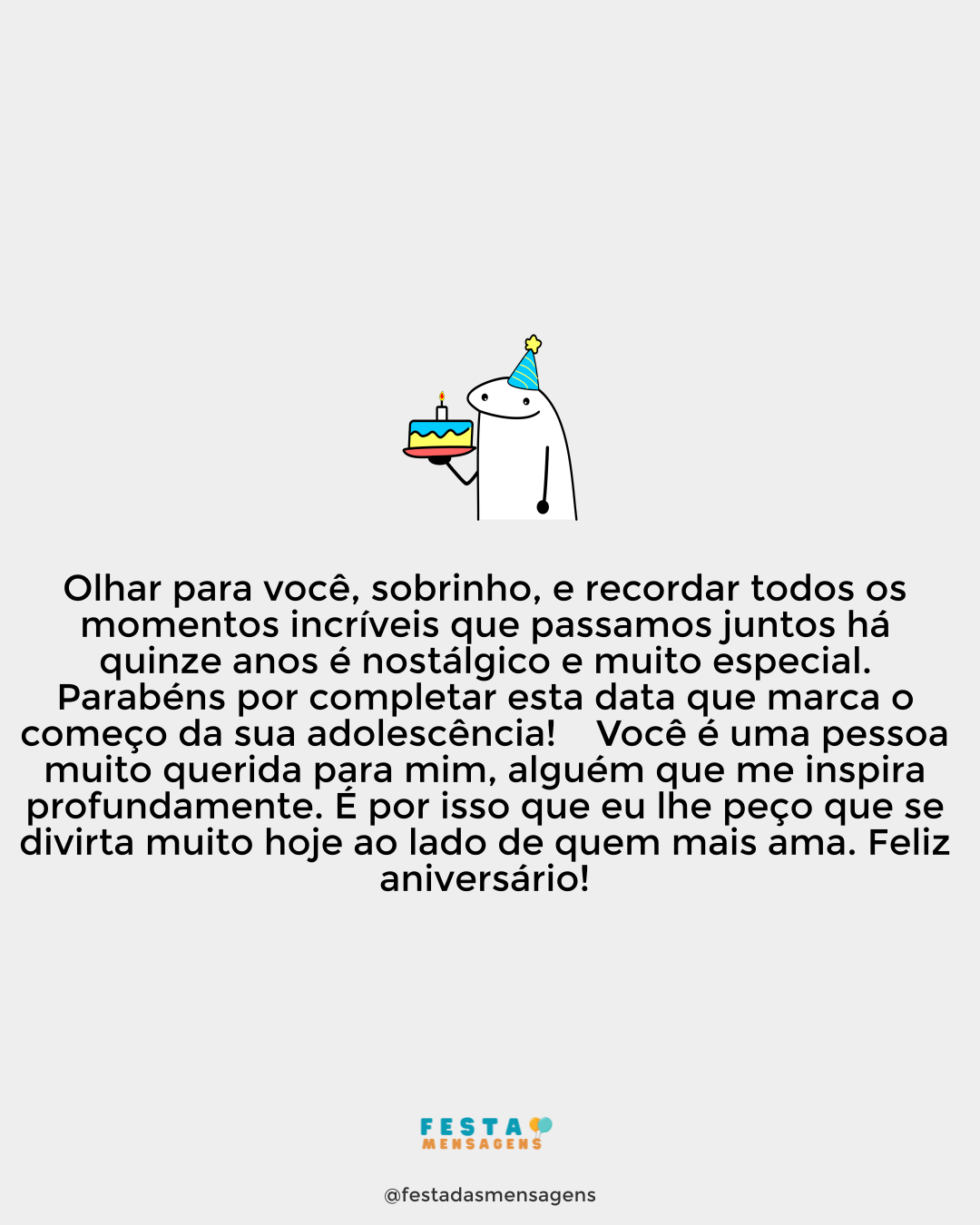 Essa mensagem é para homenagear você, linda menina, nesta fase tão bonita dos seus 15 anos. Estamos todos aqui reunidos em nome de toda paz e toda felicidade que Deus nos permite, e todas as pessoas que estão aqui sentem o grande privilégio de comemorar os seus lindos e sonhados 15 anos. Todos os momentos marcantes de muitos sorrisos desde o seu nascimento devem e precisam ser comemorados à altura de tudo o que você merece receber. Os gestos afetuosos ficaram registrados em nossos corações de uma forma inesquecível e muito especial. Nesta mensagem todo carinho é demonstrado visivelmente através de lágrimas cristalinas de felicidade. Plante sementes de bondade e permita que elas cresçam e se fortifiquem, caminhe alegre pela vida, saiba que a força de Deus jamais abandona alguém, pois está dentro de cada um de nós. Felicidades, linda menina, e que os nossos melhores e maiores votos de felicidade lhe acompanhem por toda a sua vida tão preciosa! Parabéns pelos seus 15 anos!