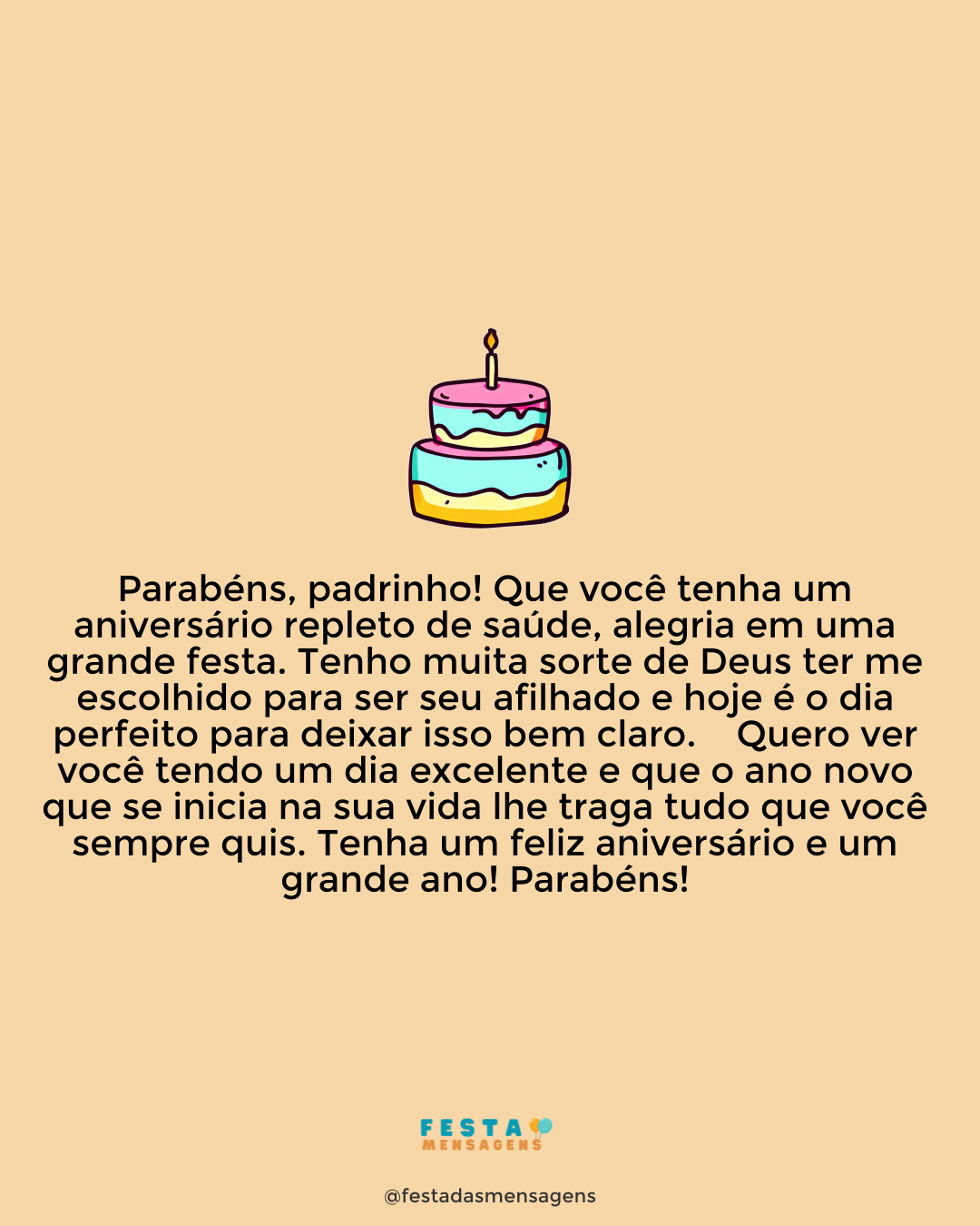 Parabéns por mais uma primavera, filho! Você é a prova viva de que o amor é a ligação mais profunda que existem, maior do que a união de sangue. Divirta-se muito hoje e lembre-se que estarei sempre ao seu lado, torcendo para que tudo dê certo na sua vida. Que esta data fique para sempre marcada no seu coração.