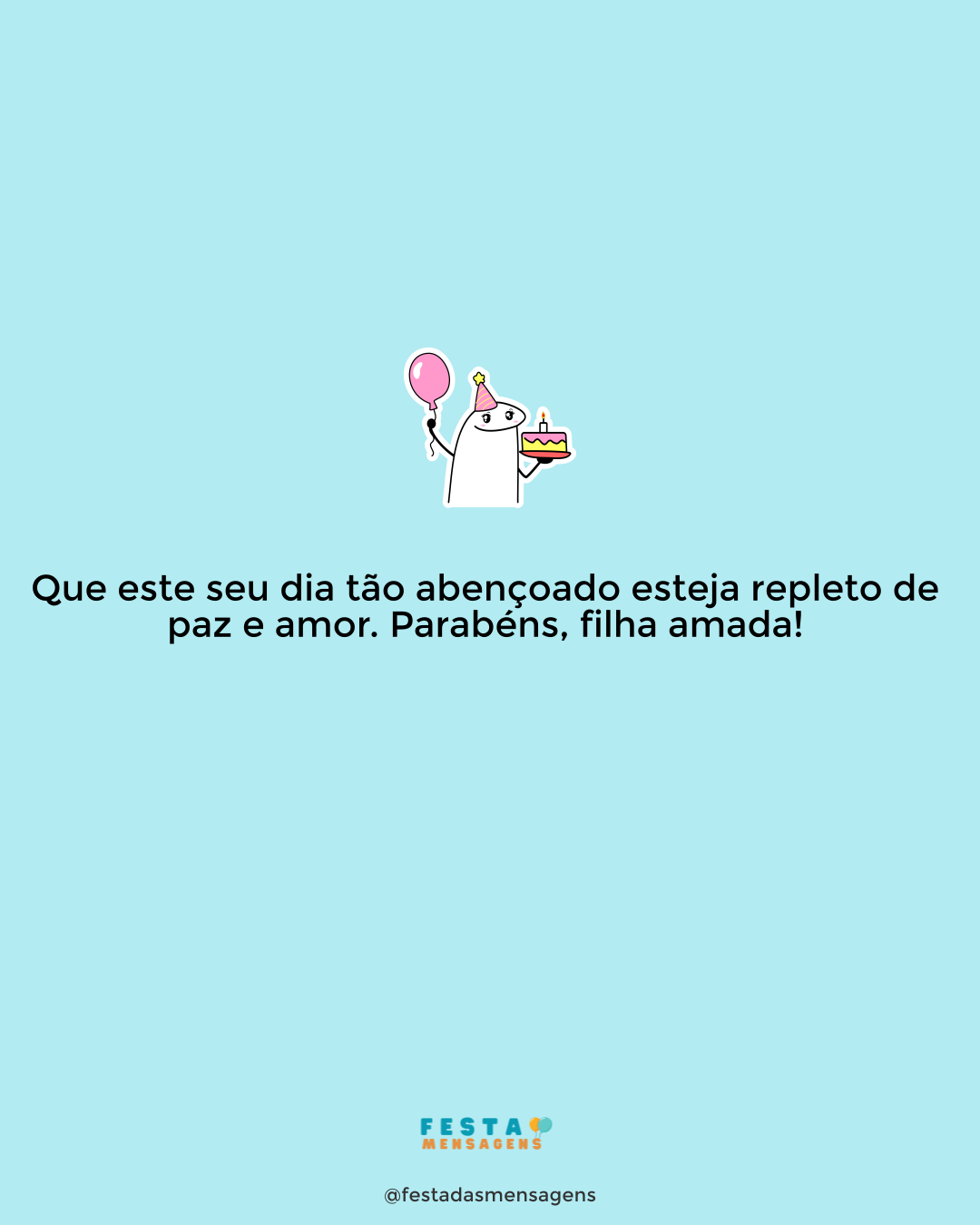 Minha filha, tenha um dia lindo e cheio de surpresas. Você é o grande amor da minha vida, o foco de toda minha atenção. E por isso lhe desejo um aniversário único e memorável. Parabéns por 26 anos de vida! Tenho muito orgulho na menina e mulher que você se tornou. Continue lutando pela sua felicidade e lembre-se que estarei sempre ao seu lado acompanhando seu caminho. Te adoro, querida. Feliz Aniversário!