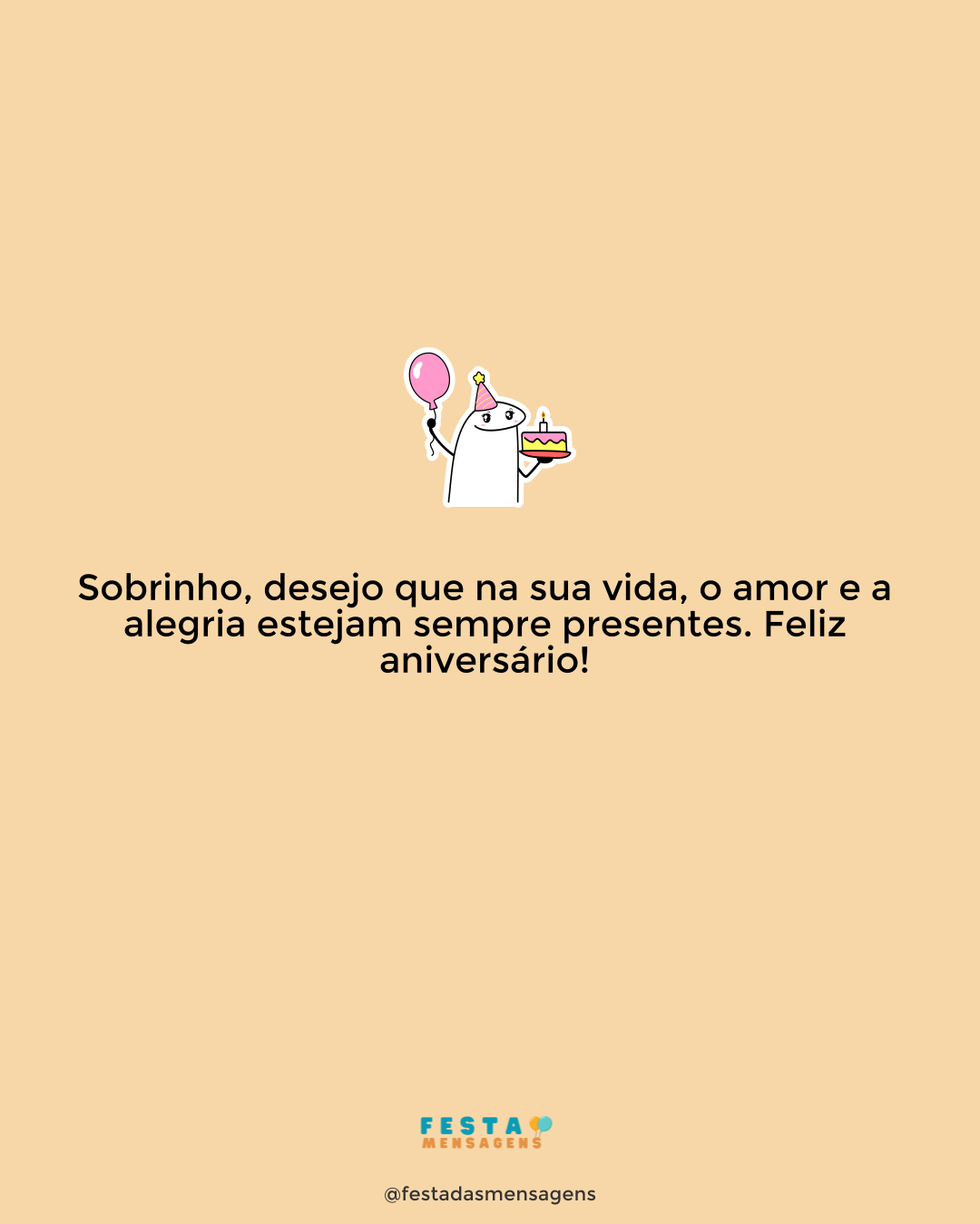 Sinto que este dia vai ser muito especial. Você está um ano mais forte e capaz, um ano mais feliz. Parabéns por completar doze meses de experiências incríveis para recordar no futuro! Tenho muito carinho por você e muito orgulho no seu percurso. Na verdade, se existe alguém que me inspira, essa pessoa é você. Talvez por isso eu tenha tanta certeza que esta sua jornada vai ser maravilhosa! Divirta-se muito e nunca deixe de correr atrás das coisas que mais ama neste mundo. Valorize tudo, especialmente os pequenos gestos de grandes pessoas. De você, eu valorizo tudo, meu bem! Feliz aniversário!