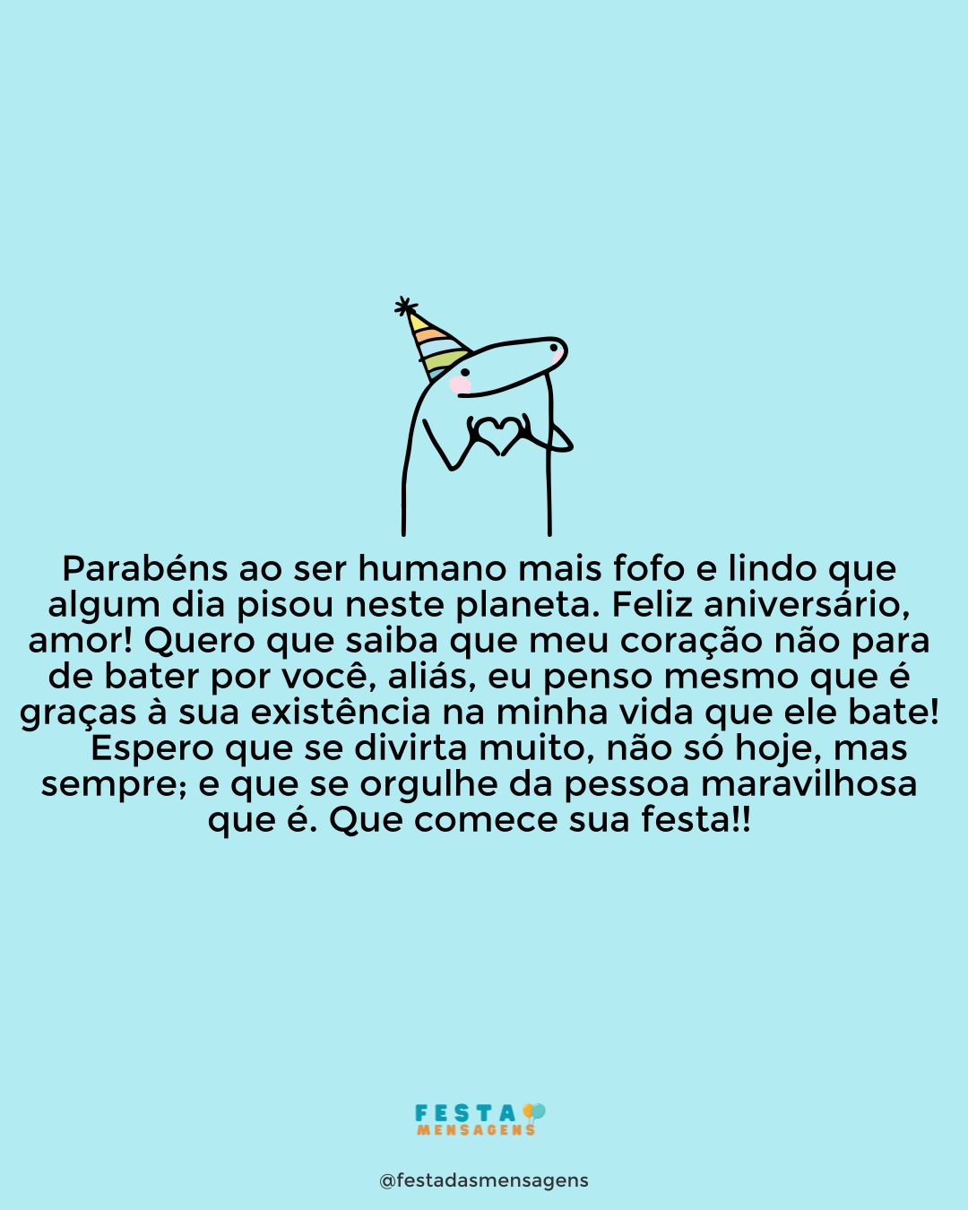 Sinto que este dia vai ser muito especial. Você está um ano mais forte e capaz, um ano mais feliz. Parabéns por completar doze meses de experiências incríveis para recordar no futuro! Tenho muito carinho por você e muito orgulho no seu percurso. Na verdade, se existe alguém que me inspira, essa pessoa é você. Talvez por isso eu tenha tanta certeza que esta sua jornada vai ser maravilhosa! Divirta-se muito e nunca deixe de correr atrás das coisas que mais ama neste mundo. Valorize tudo, especialmente os pequenos gestos de grandes pessoas. De você, eu valorizo tudo, meu bem! Feliz aniversário!