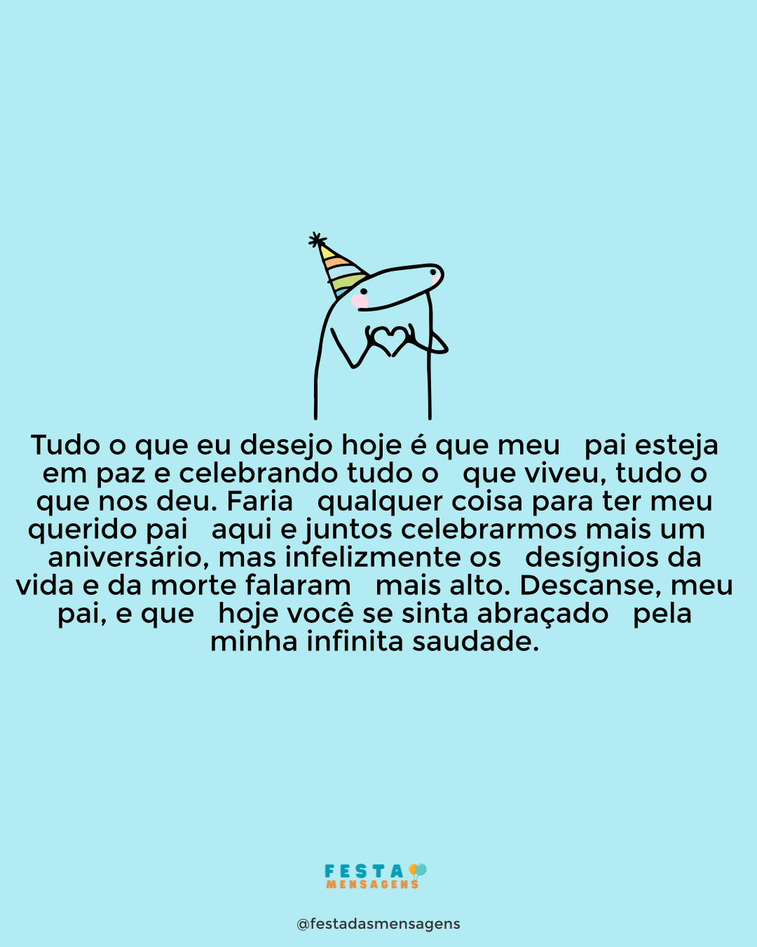 Feliz aniversário! Papai, hoje eu quero lhe desejar toda sorte, paz, alegria e amor do mundo. Que Deus abençoe esta data que promete ficar para sempre guardada na sua memória. Você é minha inspiração, o ser humano mais lindo que conheço… É exatamente por isso que eu torço por todos os seus sucessos! Divirta-se muito na graça e amor de Deus e orgulhe-se de tudo que conquistou no último ano. Te amo, meu pai!