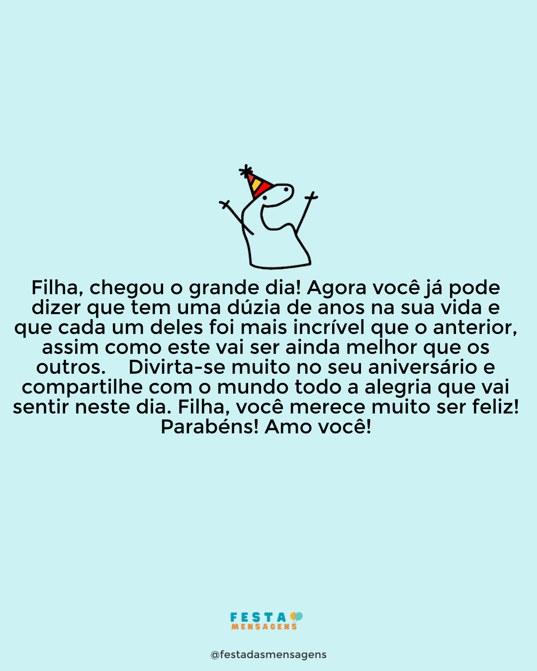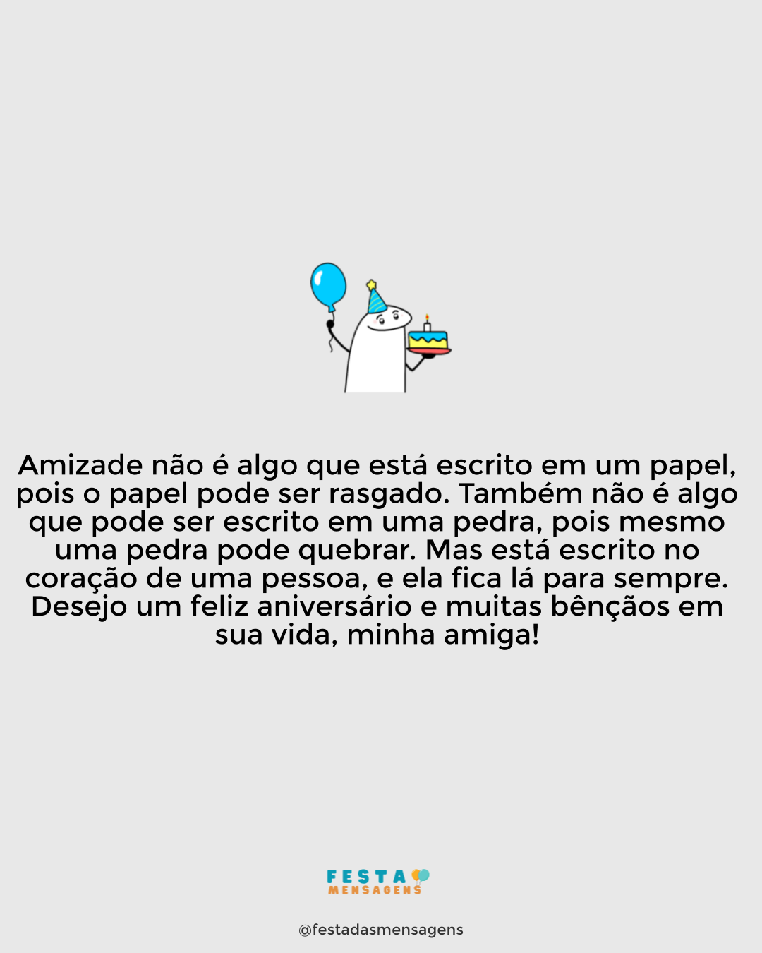 Parabéns, amiga! Que o sol invada seu dia e o preencha com energias maravilhosas e positivas, do jeito que você merece. Tenha um aniversário feliz, cheio de vida e alegria com presentes e muitas surpresas! Nunca deixe de ser essa menina mulher cheia de doçura, mas também de força e coragem. Tenho muito orgulho em ser seu amigo e contar com seu apoio em tudo que eu precisar. Só espero que se divirta muito, sem limitações. Coloque aquele sorriso que é só seu e que cativa o mundo inteiro e sinta-se em paz, amada e apaixonada por tudo e todos ao seu redor. É assim que quero ver você: completa, feliz.