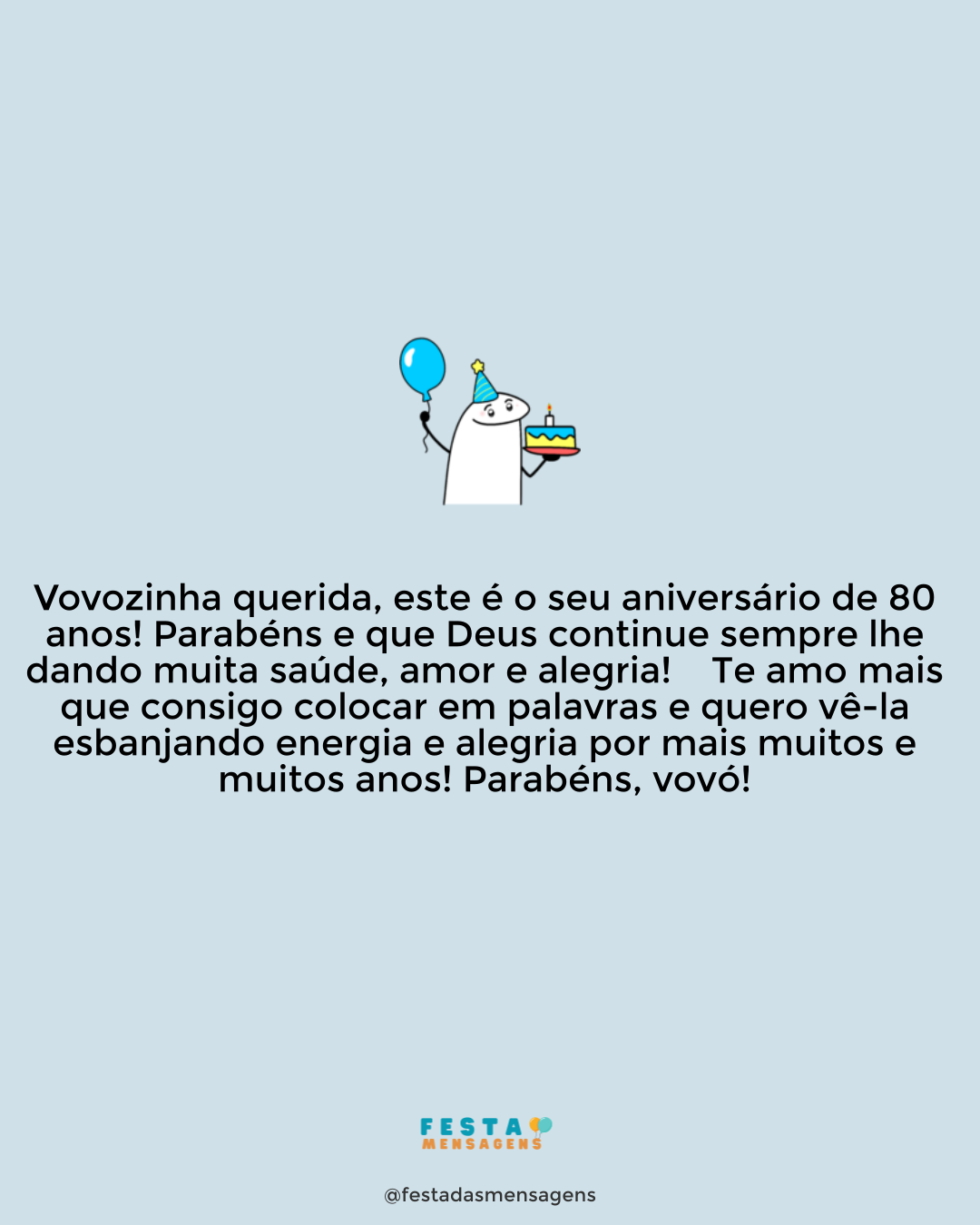 Feliz aniversário, mamãe querida! Tanta vida você já conta, tantos anos de grandes e importantes realizações. Sinto profunda emoção por fazer parte importante dessa sua longa e plena vida, e um orgulho que não cabe em meu peito. Você é um exemplo, uma inspiração para todos nós. Você me deu a vida e me ensinou a vive-la, e isso não tem preço. Retribuo com meu amor e toda minha atenção, mas sinto que você merece muito mais. Reconheço seu valor, mas queria que o mundo inteiro também reconhecesse. Você é uma mulher extraordinária, e sei que ainda tem muita vida para viver, muito para ensinar a todos nós. Mas o seu legado vai muito mais além desta vida, disso não tenha dúvida. Minha mãezinha, meu grande orgulho, que Deus a guarde entre nós por muitos e bons anos. Que seja sempre feliz e realizada e continue demonstrando que idade é apenas um número. Te amo, minha mãe!