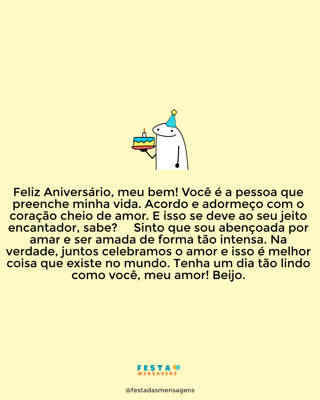 Hoje não é o meu dia de ganhar presentes, mas poder compartilhar com você este dia tão lindo e único faz com que me sinta especialmente abençoada. Tenho certeza que o nosso Senhor preparou maravilhas para celebrarmos o dia em que completa mais um ano de vida! Vamos levantar as mãos aos céus por todas as bênçãos alcançadas e deixar que o espírito Santo derrame rios de glória por onde quer que você passe. Que o amor que nos uniu se mantenha forte pelo resto das nossas vidas e que o caminho do Senhor nos oriente todos os dias. Espero que as bênçãos de Deus inundem a sua vida, juntamente com o meu amor e o de todas as pessoas que fazem parte do universo maior que chamamos de família. Parabéns meu amor, que você seja infinitamente feliz e contagie a todos com o melhor exemplo da Palavra Divina.