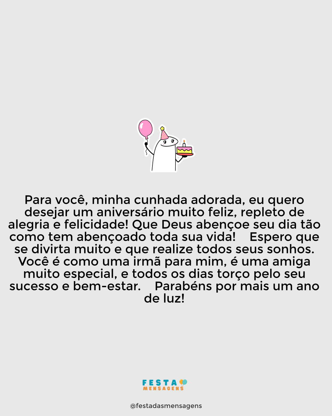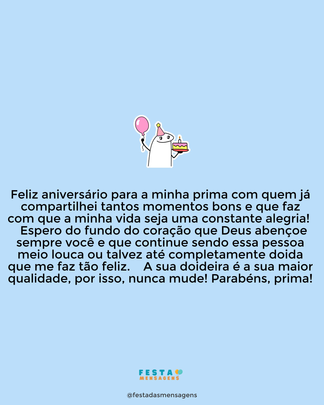 Minha prima querida e mulher mais doida que conheço, hoje o dia é todo seu e eu já sei que será incrível. Que possa celebrar de forma louca e intensa como você gosta. Você é uma pessoa muito especial que sempre alegra os ambientes e eu sou muito feliz por tê-la como prima e amiga. Que este dia devolva para você toda a felicidade que espalha por aí. Aproveite, prima! Feliz aniversário!