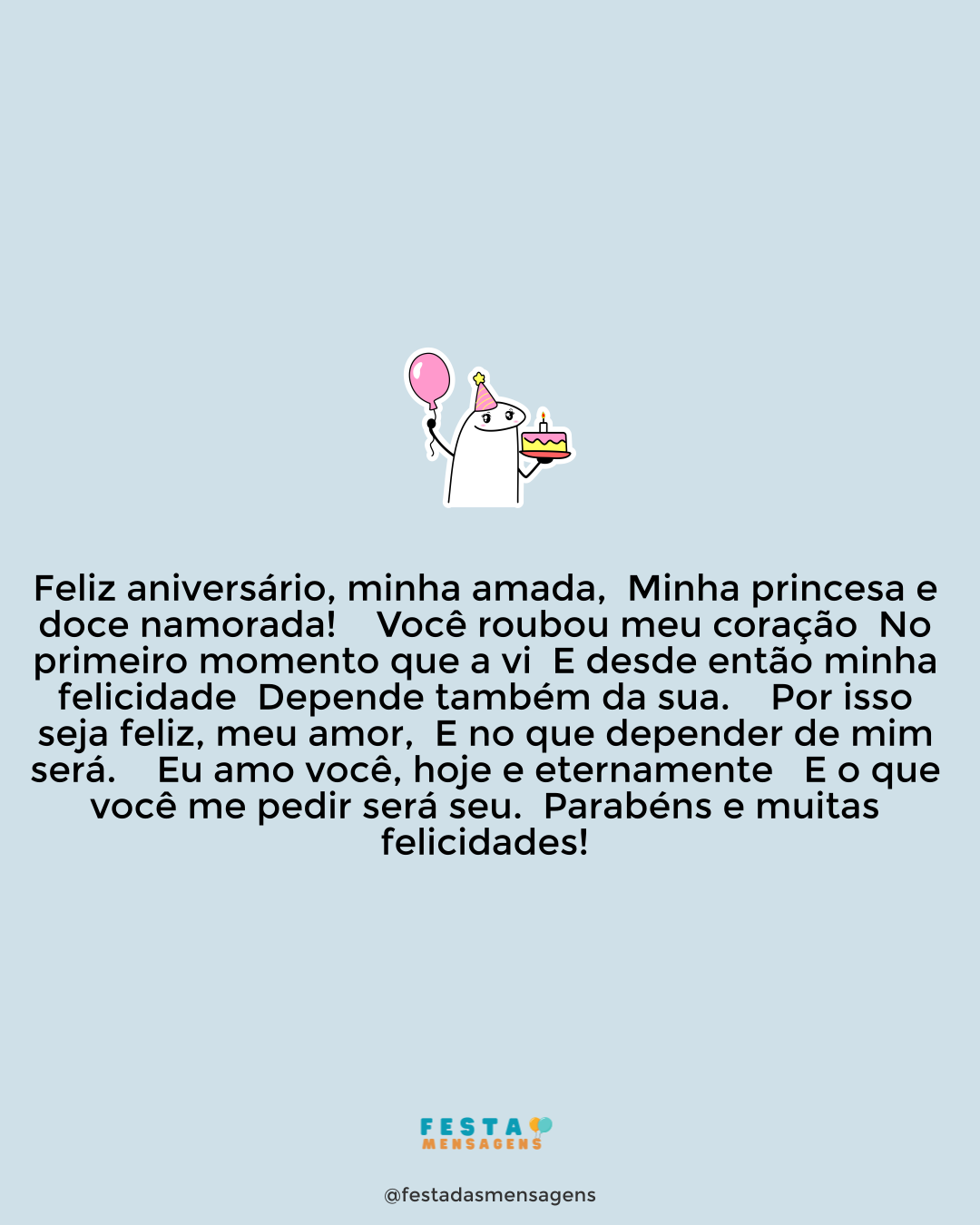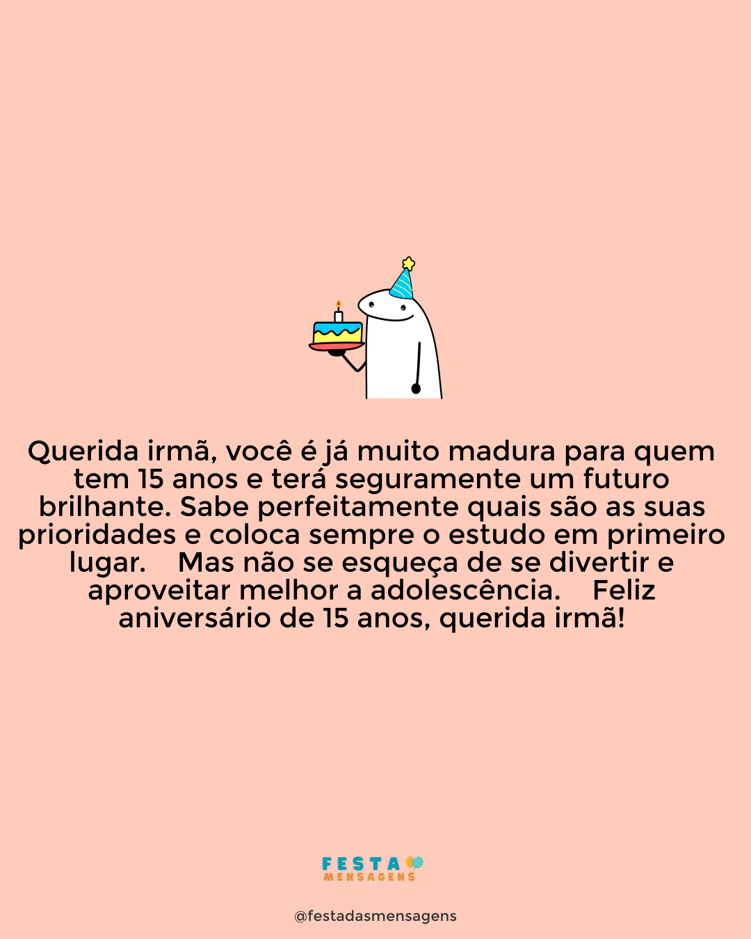 Feliz Aniversário, prima! Quero que saiba que, apesar da distância, eu nunca deixo de pensar em você com todo o amor e carinho que um pensamento pode carregar. Pois para mim você é mais do que uma amiga, muito mais do que uma pessoa ligada por algum laço de sangue, é mesmo muito mais do que uma irmã. Em todos os meus melhores pensamentos você está presente, e hoje em especial todos os meus pensamentos estão voltados para você. Neste dia glorioso em que celebramos o seu nascimento, todos os meus pedidos invocam a manutenção da sua saúde, da sua alegria e da sua felicidade. Parabéns!