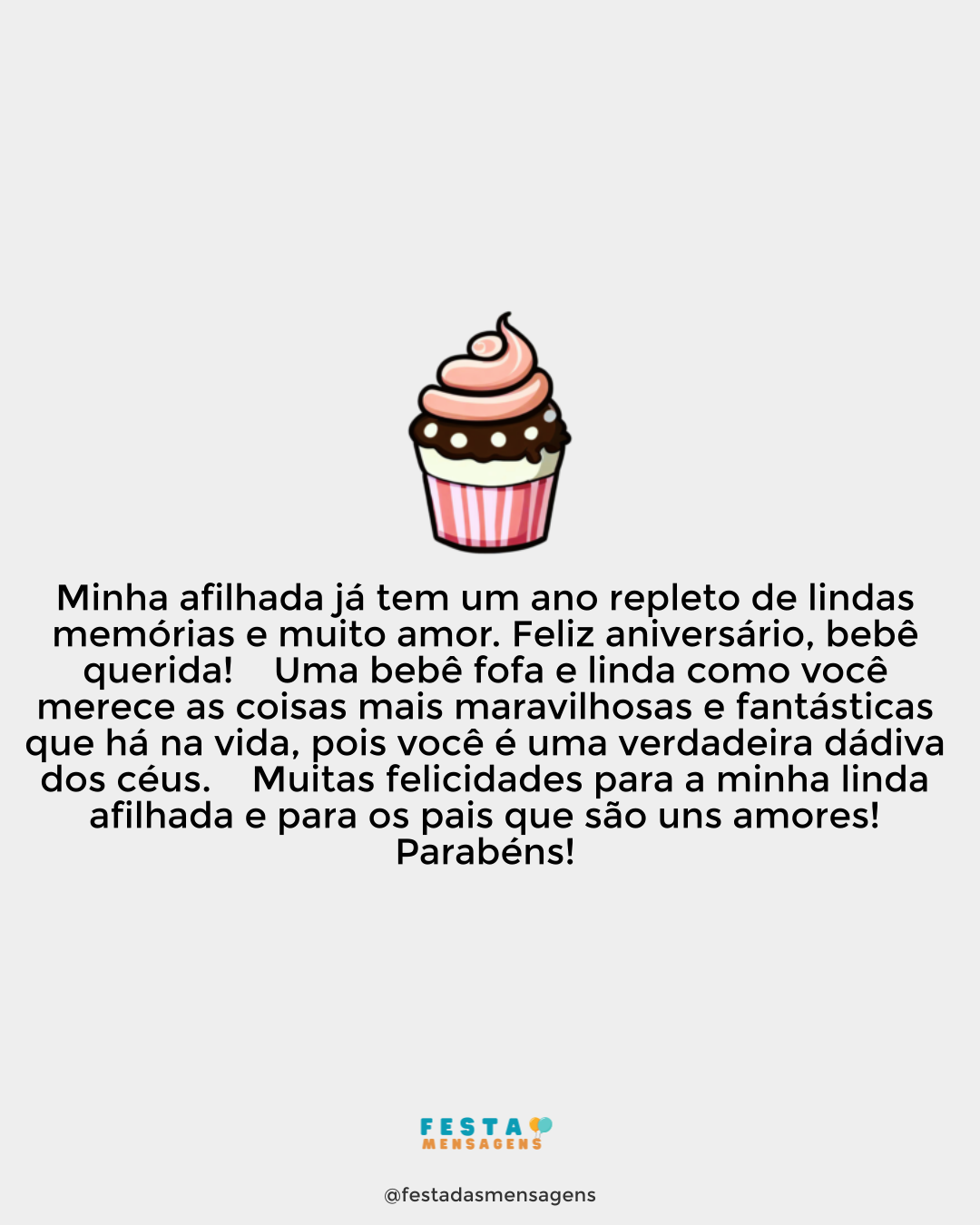 Fico muito emocionado em todos os seus aniversários, querida afilhada. Para um padrinho, é um momento especial ver sua afilhada completar mais um ano. Vejo você crescendo, amadurecendo e não posso deixar de lembrar de quando você era muito pequena nos meus braços. Ter uma afilhada foi a melhor coisa que já me aconteceu. Desejo um novo ano repleto de paz, proteção e felicidade. Você é uma menina muito especial e eu sou muito feliz por ser seu padrinho. Seja feliz, meu anjo! Tenha um feliz aniversário!