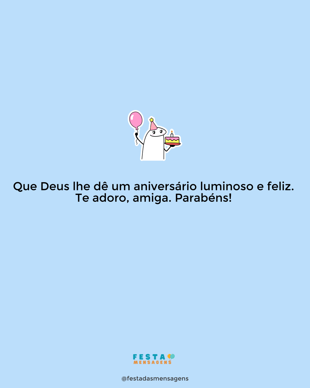 Minha amiga, pela graça de Deus hoje você comemora mais um ano de vida, e com você eu me alegro e festejo, pois é uma pessoa realmente importante para mim. Parabéns amiga! Tanto como companheira de vida como de trabalho, você é exemplar, e é ainda mais como mulher de fé. É um privilégio compartilhar não só amizade com você, mas também local de trabalho e a mesma fé. Sinto que o Senhor nos juntou porque nossas almas são semelhantes e se beneficiam uma com a outra. A Ele agradeço por isso e peço que lhe conceda muitos anos de vida, sempre comigo por perto. Celebre seu dia com muita alegria e entusiasmo, amiga, e agradeça a Deus por tão maravilhosa dádiva que é viver mais um ano. Feliz aniversário na paz e amor de Cristo!