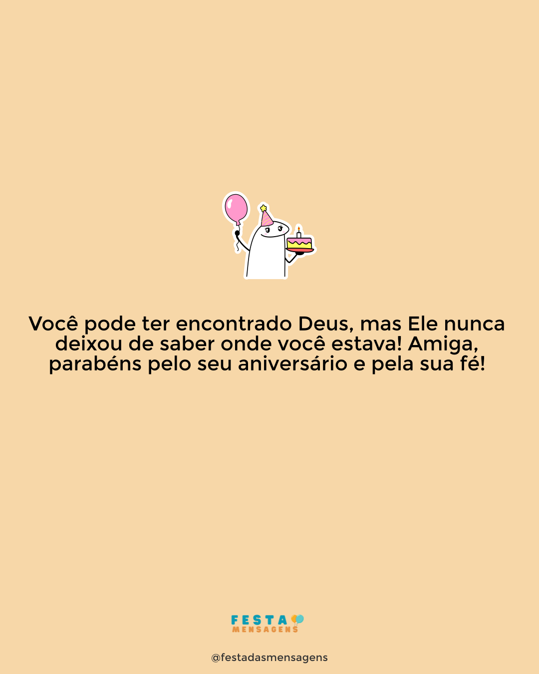 Minha querida amiga, parabéns pelo seu aniversário! Somos irmãs de fé e faço questão de lhe dar os mais sinceros votos de felicidade pelo dia de hoje! Deus está sempre nos surpreendendo em todos os momentos e prova disso é que nos aproximamos graças as crenças que compartilhamos e hoje nos consideramos grandes amigas. Espero de coração que o seu dia seja abençoado e que todas as pessoas que você ama estejam ao seu lado para celebrar esta idade nova que se inicia. Parabéns e muitas felicidades!