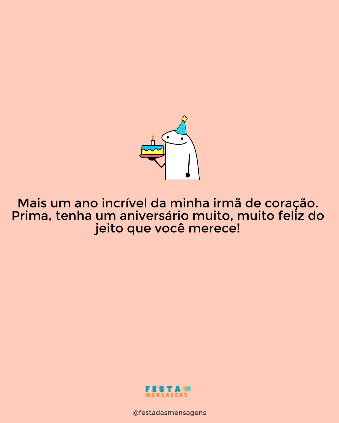Minha querida afilhada de crisma, eu quero muito lhe desejar uma jornada de amor sem fim, de bênçãos e alegrias infinitas. Que seu aniversário seja simplesmente maravilhoso! Espero que se divirta junto das pessoas que mais ama e também das que mais lhe dão amor. Você é uma pessoa magnífica e merece todo carinho e sorte deste mundo. Continue vivendo de acordo com a palavra do Senhor e lembre-se que estarei sempre ao seu lado para tudo que precisar. Você é uma inspiração para mim, alguém que adoro profundamente. Feliz aniversário, querida!