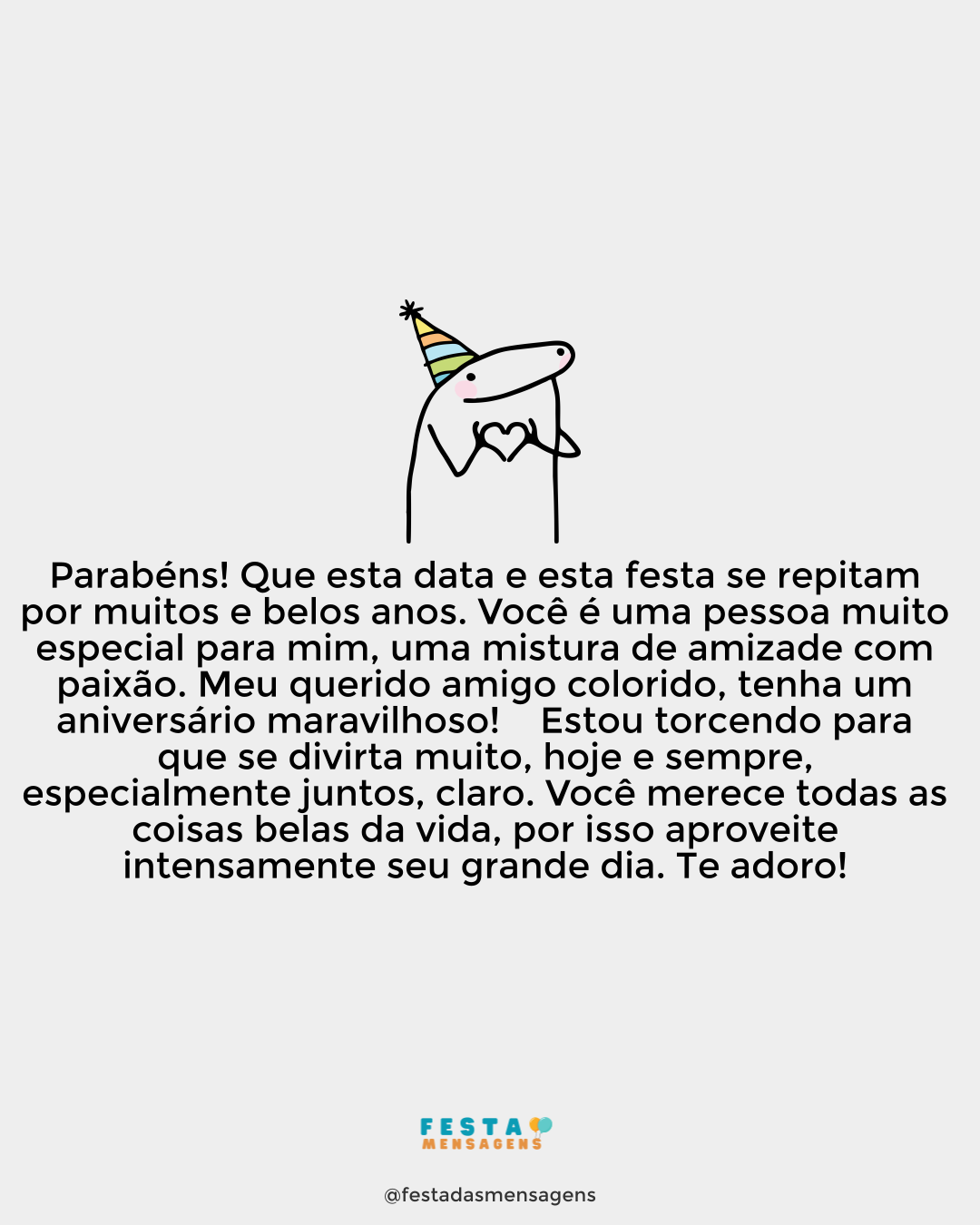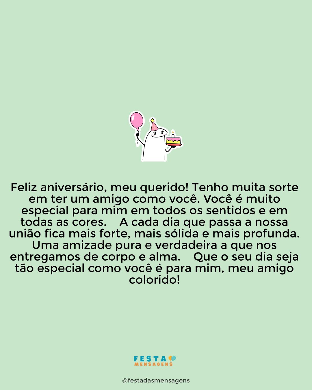 Parabéns para você, meu amigo! Muitas felicidades! A amizade nasce de um sorriso sincero, Cresce aos poucos, E quando estimada fica impossível de não tê-la mais. A amizade é tão forte como o brilho do sol, Tão grande como a lua, Tão admirada como a paisagem mais bela. A amizade cobiça fielmente a sinceridade, Alimenta a cumplicidade e devora a alegria. A amizade é algo indecifrável, Como uma língua sem tradução. Amizade é presente dos céus E a compreensão dos sonhos. Ser amigo é ter prestígio Ter conceito de companheirismo, Benevolência perfeita. A amizade é dotada de compreensão, Completa de fiel felicidade.