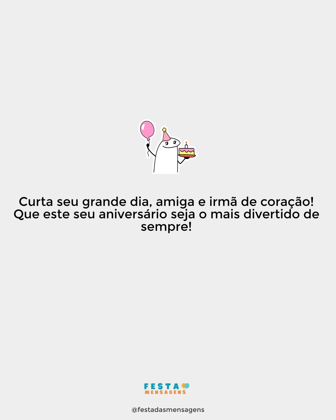 Feliz aniversário! O meu desejo é que você seja sempre minha melhor amiga e se sinta em paz, de bem com a vida, realizada. Parabéns, querida!