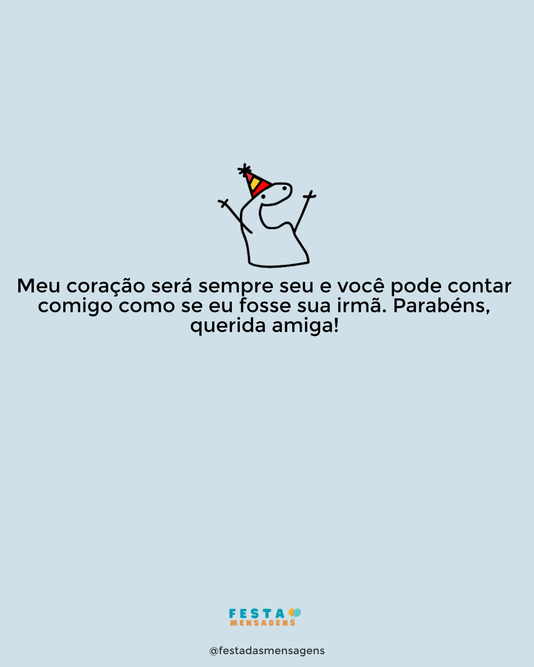 Feliz aniversário! O meu desejo é que você seja sempre minha melhor amiga e se sinta em paz, de bem com a vida, realizada. Parabéns, querida!