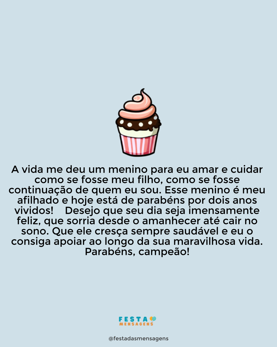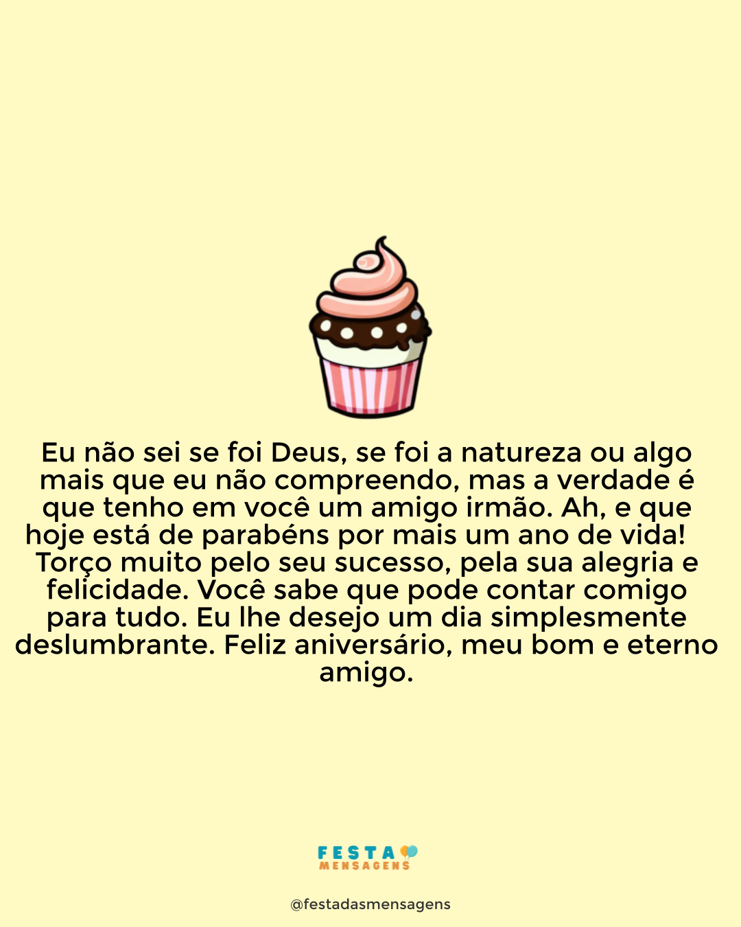 Meu irmão amado, meu protetor! Você é uma das pessoas mais importantes da minha vida, e não consigo imaginar estar longe de você, apesar de saber que estamos nos tornando "adultos" e em breve cada um seguirá o seu caminho. Mas eu serei sempre feliz de saber que tenho um irmão maravilhoso como você, com quem sempre poderei contar. Eu me orgulho muito de você e admiro muito a pessoa que está se tornando. Peço a Deus que Ele lance sobre você olhos protetores, como você lança sobre mim, pois você é muito especial e vai fazer a diferença no mundo. Obrigada por tudo, meu irmão! Hoje eu desejo que o seu dia seja muito especial, que seja de festa, comemoração e alegrias. Desejo que passe o dia cercado de amigos e familiares, e que este seja o início de um novo ano repleto de realizações, muita força, saúde, sucessos, amor e paz. Parabéns! Eu te amo, meu irmão!