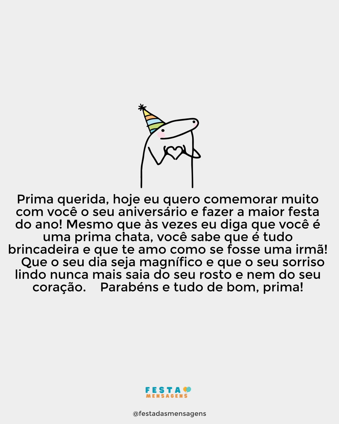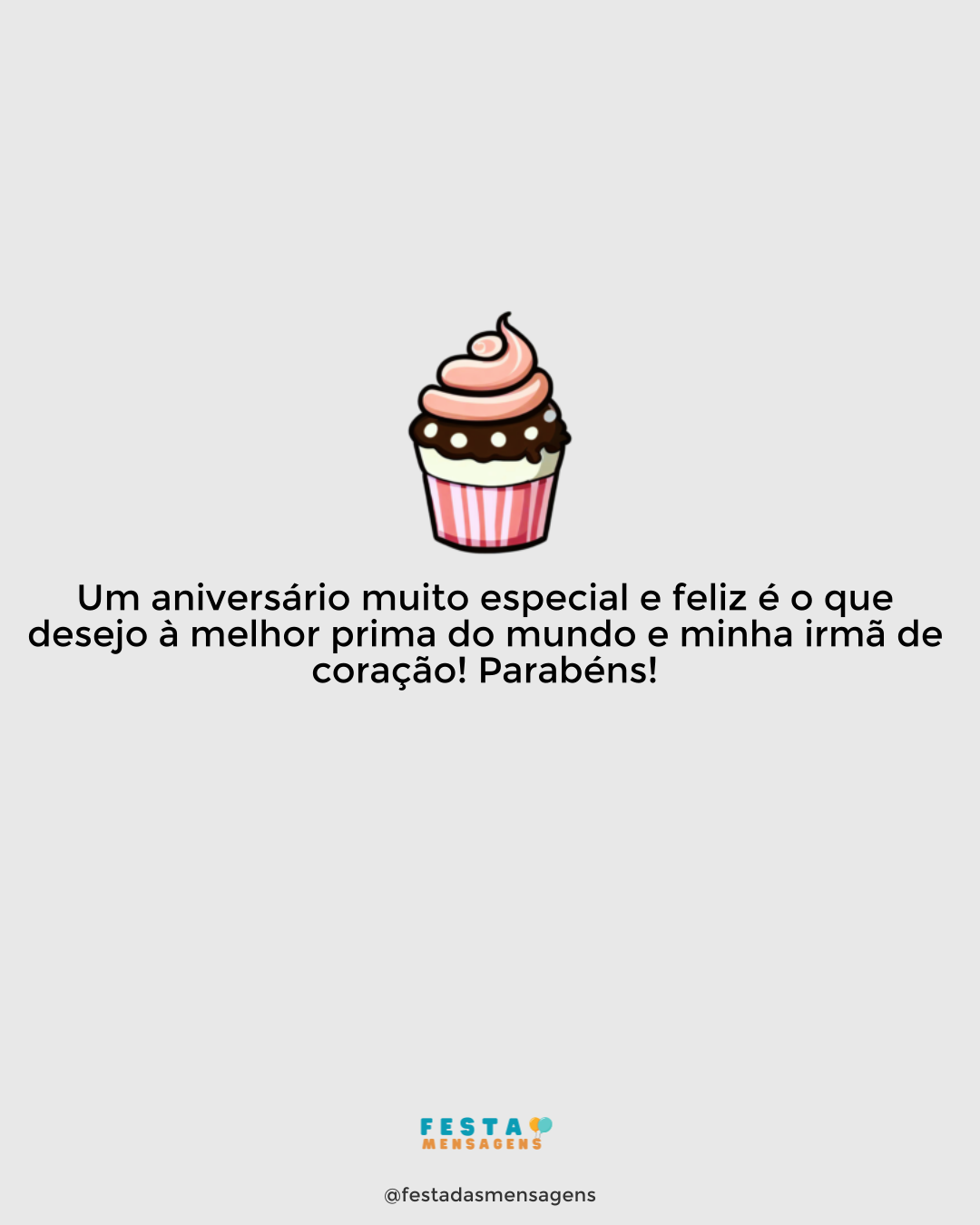 Hoje celebramos seu dia, prima! Será uma comemoração muito especial junto da família e dos amigos sob o olhar atento de Deus, até porque você merece tudo que existe de positivo no mundo. Tenha um feliz aniversário, querida! É um privilégio ter você na mesma família que eu e poder compartilhar meus dias ao seu lado. Conte comigo para tudo que precisar e não se esqueça que a felicidade é obra do Senhor e só depende de você para acontecer. Beijo, prima!