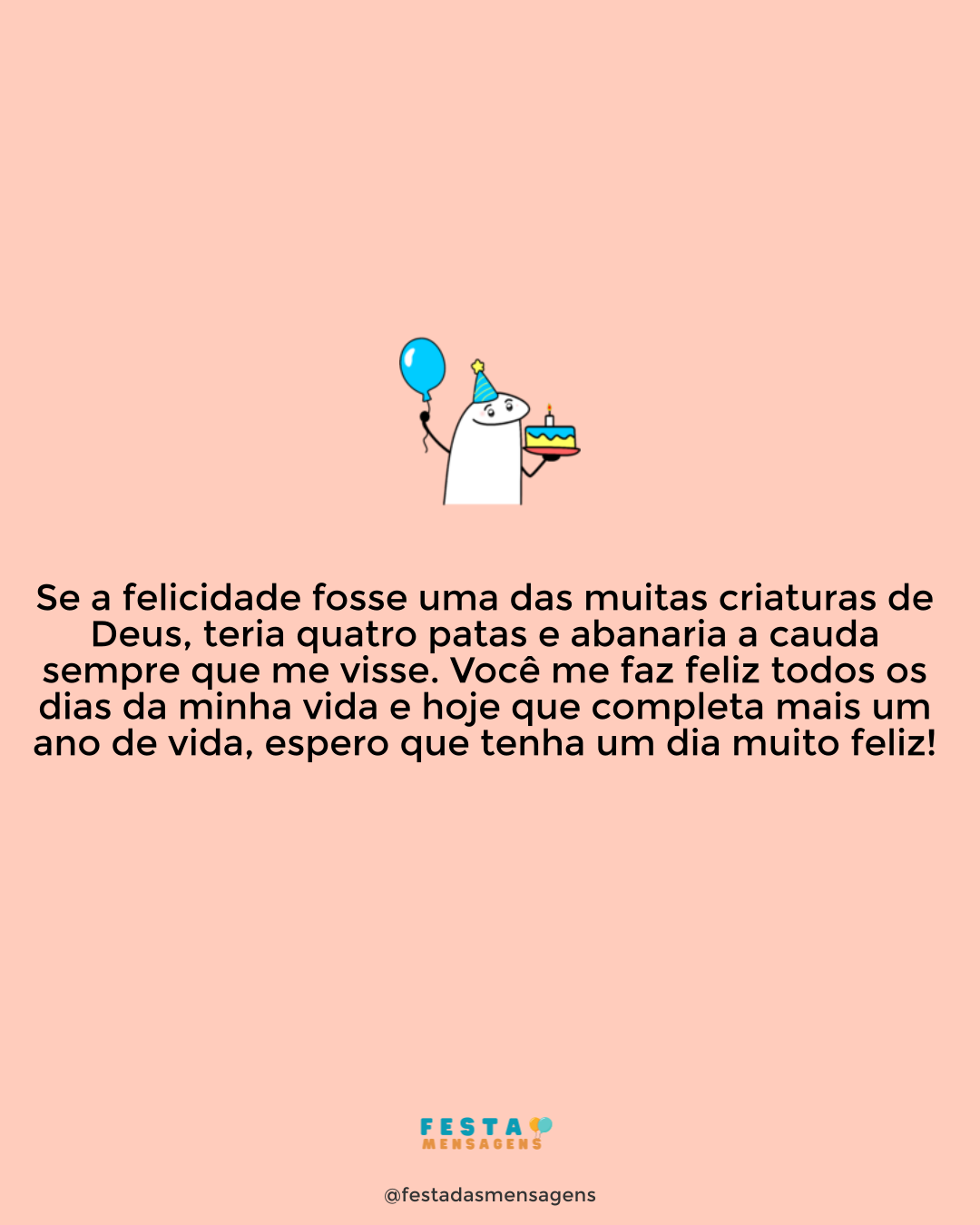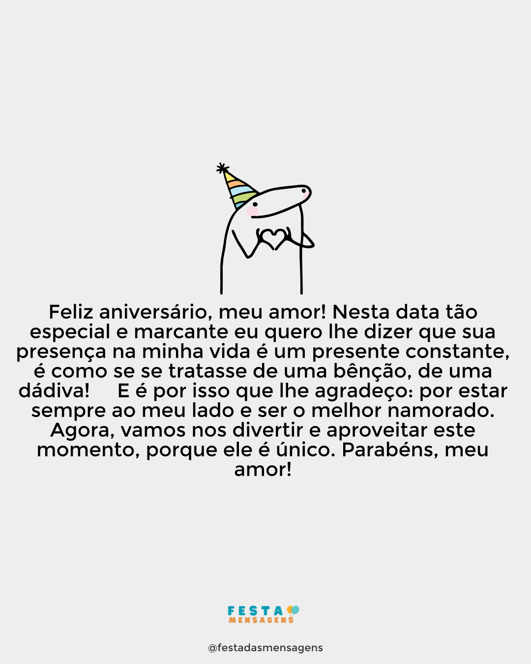 Que no mundo existam tantas pessoas e que no meio delas todas eu tenha podido achar você, e ter a extraordinária sorte de poder compartilhar a vida com você, é de fato uma maravilha pela qual todos os dias agradeço. Feliz aniversário, meu amor! Você é o melhor dos maridos, o melhor dos companheiros e um amigo para todos os momentos. Nossa cumplicidade é única e o nosso amor me dá a força necessária para enfrentar tudo, transformando o pior dos momentos em apenas mais um obstáculo de fácil superação. Minha felicidade depende também da sua, pois você é meu mundo, minha vida, o ar que eu respiro! Desejo que esta data se repita até ao infinito e que possamos continuar sempre juntos, com saúde, paz e muito amor. Eu amo muito você, ontem, hoje e para sempre!