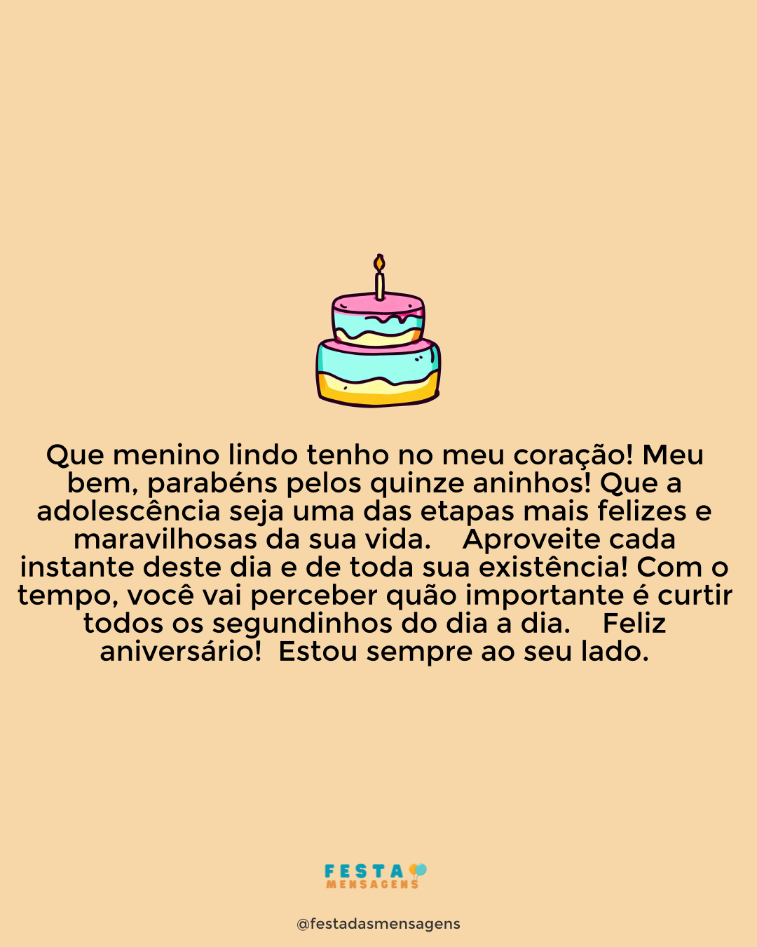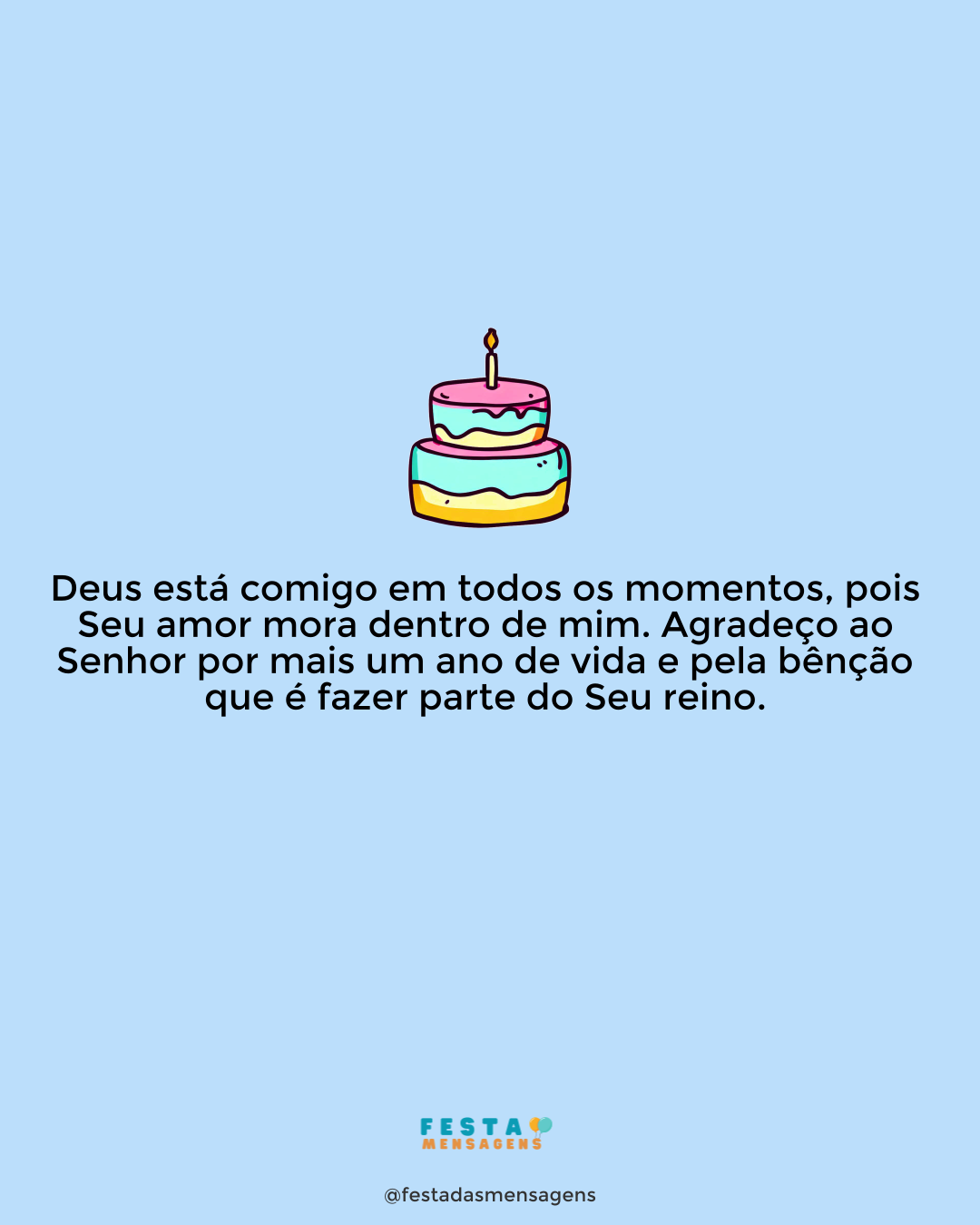 Neste dia sinta o abraço amoroso do Deus criador dos Céus e da Terra! Apesar de ser um Deus Todo Poderoso, Ele se preocupa com cada um de nós, e quer sempre o nosso bem. O Seu amor é mais forte do que qualquer problema. Que todos os anos você possa conhecer cada vez mais a vontade do Senhor para a sua vida, e ser um verdadeiro embaixador de Cristo. Você pode ter a certeza que a Sua fidelidade está presente todos os dias da sua vida! Ele será a sua força quando você estiver cansado, e o alívio da sua dor. Que a força do Criador seja a sua força neste novo ano da sua vida. Feliz Aniversário!
