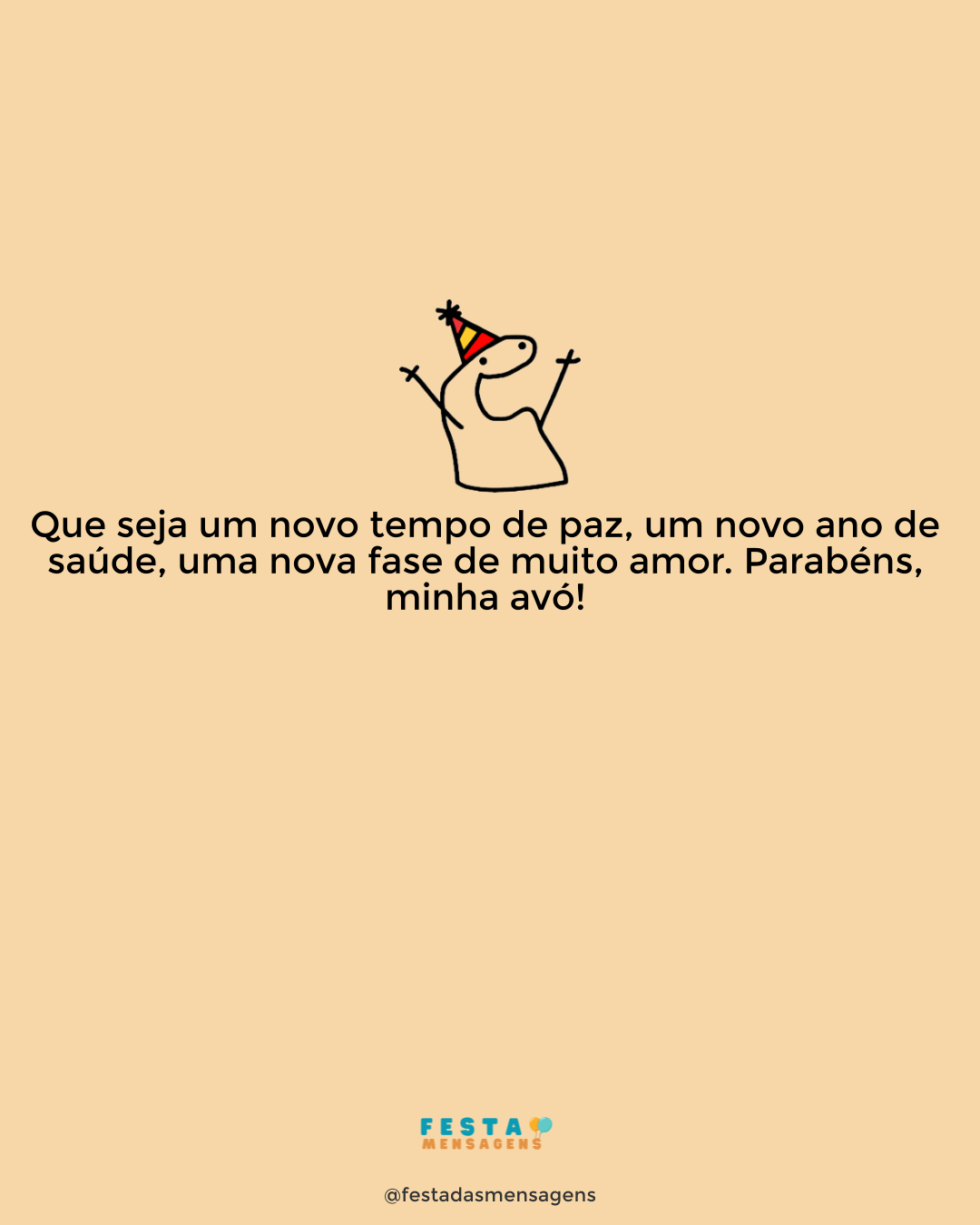 Minha querida bisavó, é uma pena que não vamos poder passar esta data juntos, mas quero que saiba que estou pensando muito em você e desejo que seu aniversário seja de muita alegria e festa. Parabéns! Você está sempre na minha mente e sei que sem você como referência não seria a pessoa que sou hoje, nem teria alcançado tantos objetivos dos quais me orgulhasse. Bisa, aproveite muito o seu dia e festeje cada segundo dele! Estaremos juntos em breve! Feliz aniversário!
