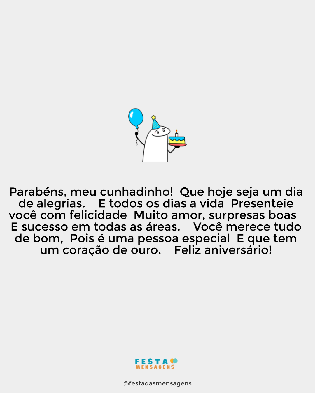 Meu maninho, meu chaveirinho, meu amorzinho. Você sabe como eu o amo e como você é especial para mim. Eu sei que algumas vezes não tenho muita paciência, mas você é a coisa mais fofa da minha vida, o meu bem maior apesar de pequenino. Hoje nós vamos cantar parabéns para você e apagar as suas velinhas com muita felicidade no coração. Hoje é dia de bolo, brigadeiros e presentes, tudo para celebrar o seu aniversário, o dia da sua vinda para as nossas vidas. Parabéns e muitas felicidades! Que a sua vida seja sempre doce e cheia de alegria. Te amo muitão e fortão!
