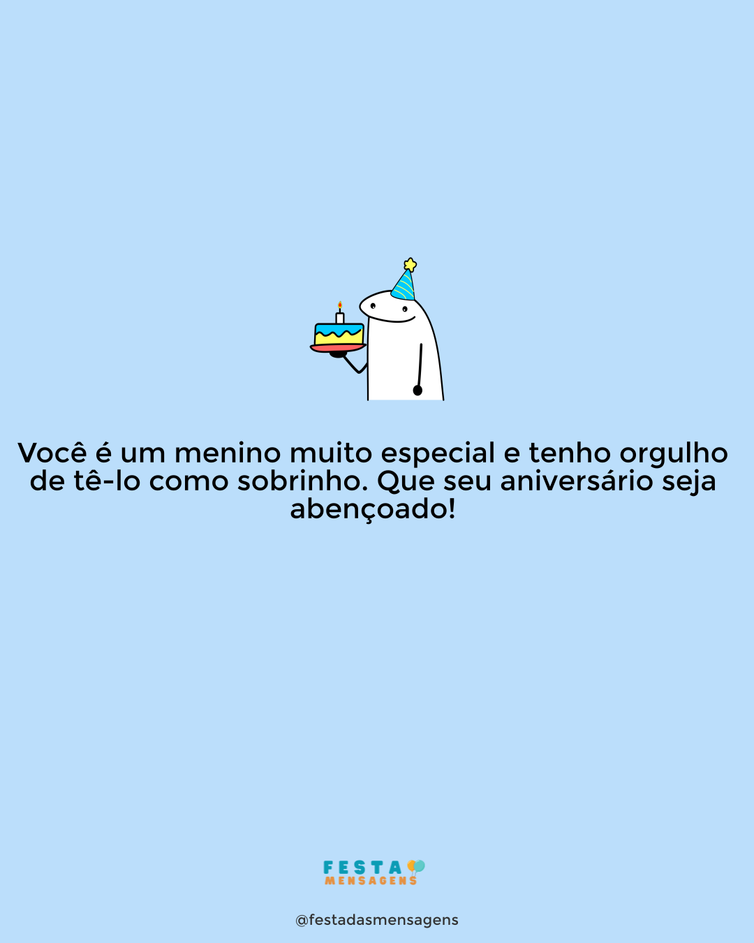 Quem tem um sobrinho como eu tem alegria como poucas pessoas têm. Feliz Aniversário! Desejo que seu dia fique marcado por emoções positivas, aventuras inesquecíveis e sonhos realizados. Você é e será sempre como um filho para mim. Só desejo que esta data seja celebrada com muita energia positiva junto das pessoas que você mais ama. Parabéns, sobrinho!