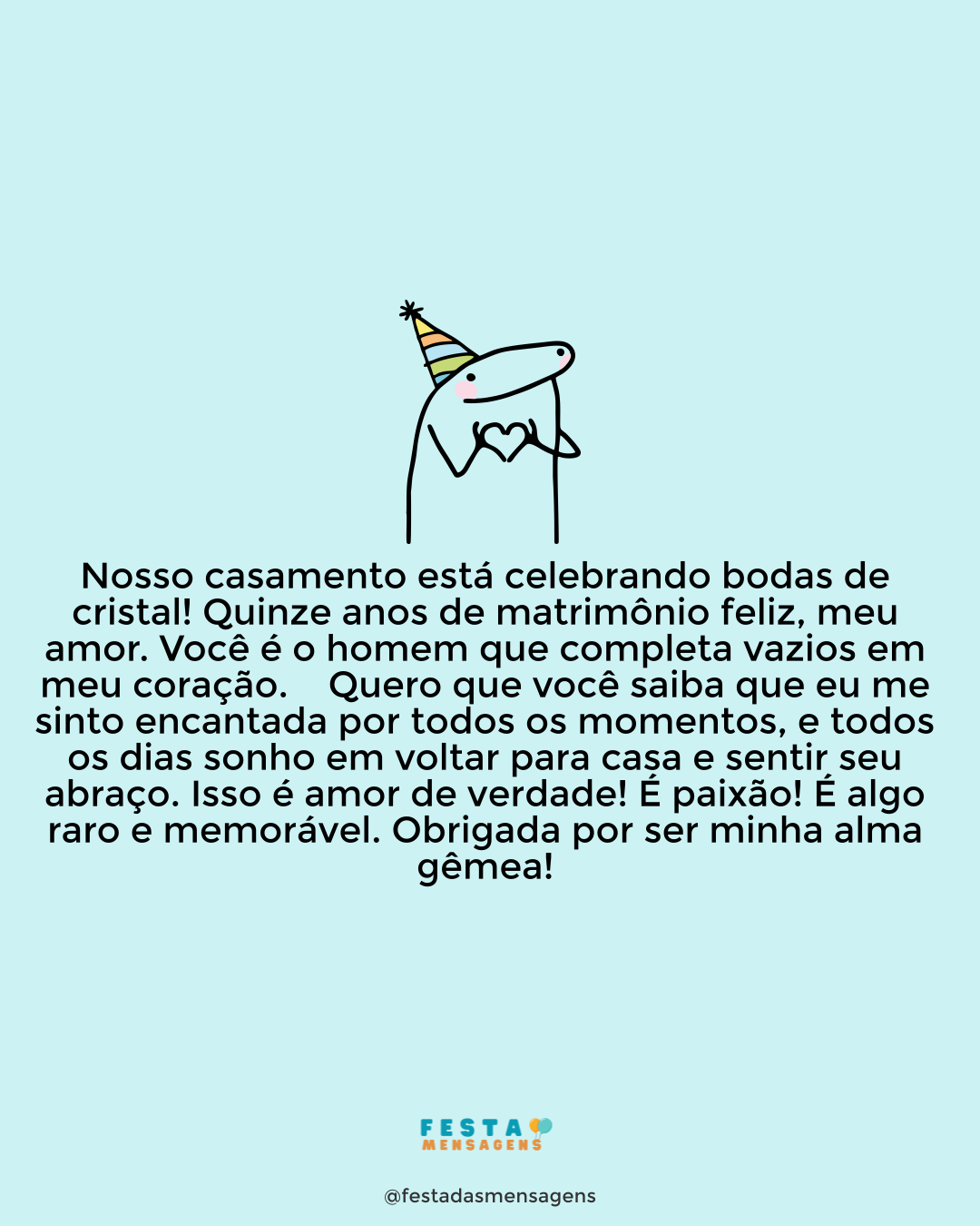 Nosso casamento chegou à maioridade, meu amor! Nem acredito que já faz 18 anos que estamos juntos. Cada segundo ao seu lado é especial e cada novo aniversário é motivo para agradecer. Sinto-me uma pessoa completa com você ao meu lado e não troco nossa conexão por nada. Você veio para iluminar nossa vida e sei que, para sempre, será assim: nós dois até o fim! Amo você!