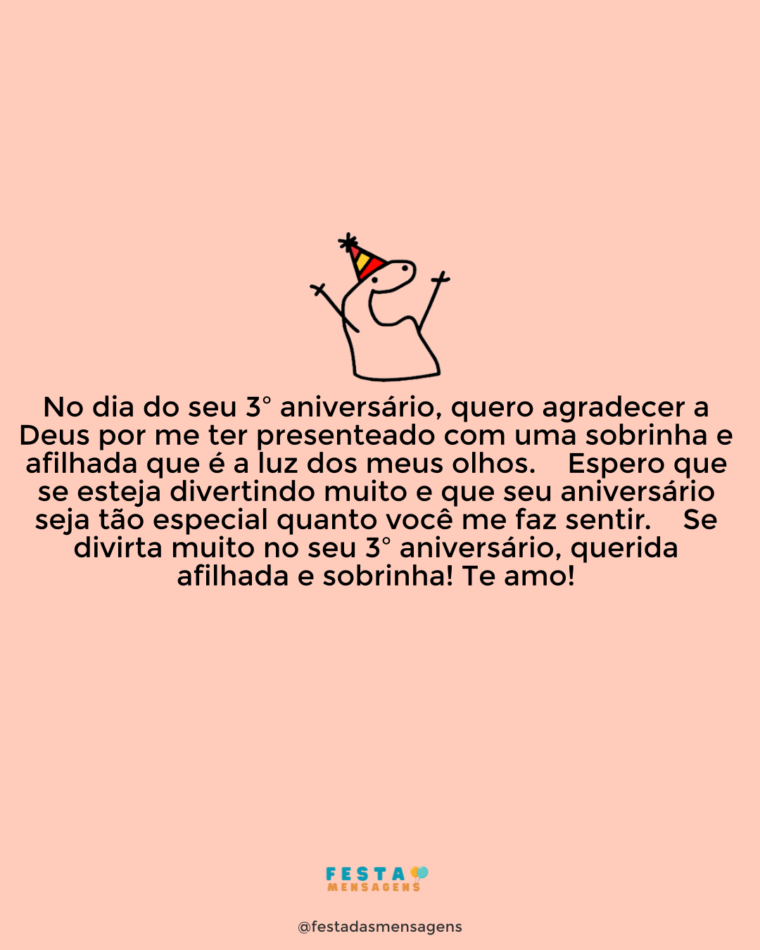 O meu sobrinho é tudo para mim, ele é praticamente um filho, alguém por quem daria minha própria vida. Hoje, no seu décimo aniversário, eu quero lhe confessar todo meu amor. Parabéns, meu querido! Saiba que estou e sempre estarei ao seu lado, aconteça o que acontecer. Tenha um dia imensamente feliz, repleto de brincadeira e muita, muita bobagem, bem do jeito que você merece!