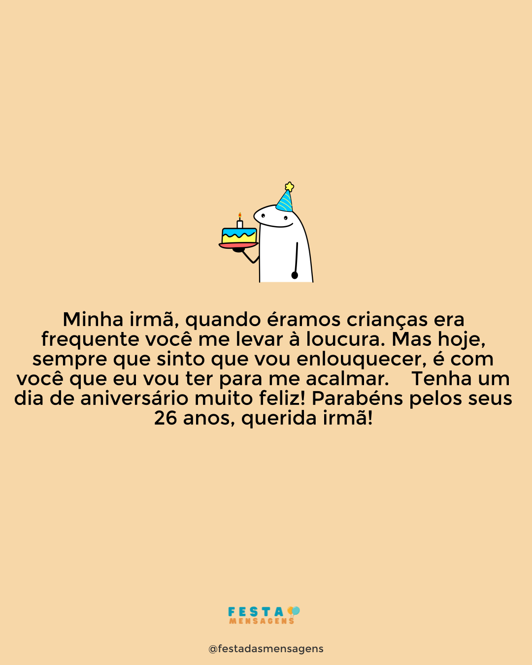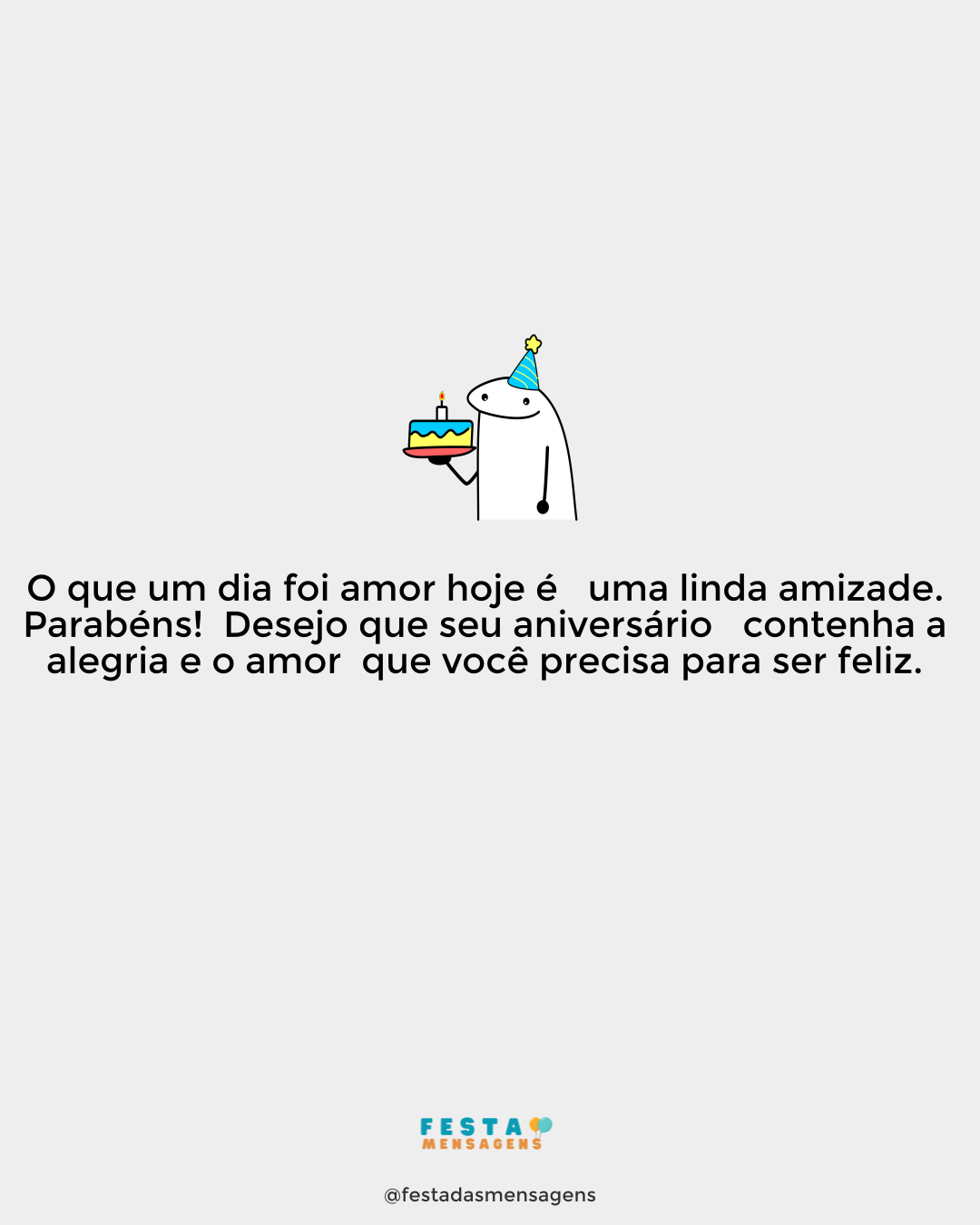 Parabéns! Desejo que hoje você conheça um lindo dia; um dia mágico, encantador. Aproveite seu aniversário com muita alegria, paz e amor junto de quem mais lhe oferece felicidade. Você merece tudo que existe de deslumbrante nesta vida. Na verdade, seu coração foi capaz de inúmeras surpresas ao longo do ano que está terminando agora. Você sorriu, chorou, cresceu, viveu! Tenho muito orgulho em ter feito parte de algumas páginas do livro dos seus últimos doze meses. Continue assim, uma pessoa honrada, simpática e sempre com algo de bom para transmitir a quem passa. Feliz aniversário!