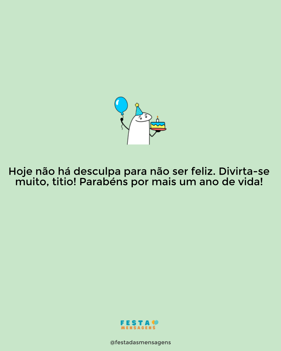 Seja feliz hoje e sempre. Você é um menino muito especial e merece tudo de bom na sua vida. Agradeço muito por ter sua mãe como amiga e por ter a oportunidade de conhecê-lo melhor. Aproveite cada segundo, pois o dia é todo seu. Que a festa seja incrível, que esteja cercado de amigos e amigas e que sorria muito para dar boas-vindas a este novo ano de vida. Tenha um feliz aniversário!