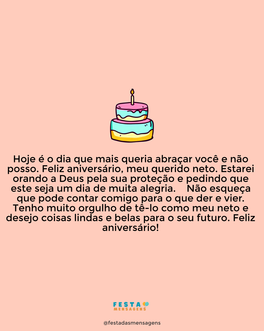 Meu primo querido, hoje vamos celebrar um dia especial, vamos comemorar mais um ano da sua presença nas nossas vidas! Você é uma pessoa especial que faz toda a diferença na nossa família. Você é amigo, dedicado e tem o poder de agrupar as pessoas. Para mim, é uma grande alegria ter você no meu álbum de recordações das alegrias mais remotas, da infância marota, e agora da vida adulta. Independentemente de ser sua prima, você é o tipo de pessoa que eu sempre gostaria de ter por perto. Espero que o dia de hoje seja lindo, como têm sido todos os dias da sua vida, e que seja celebrado com muito amor e alegria. Desejo a você muita saúde, sucesso, paz e perseverança. Nunca desista dos seus sonhos! Parabéns e muitas felicidades, meu primo querido!